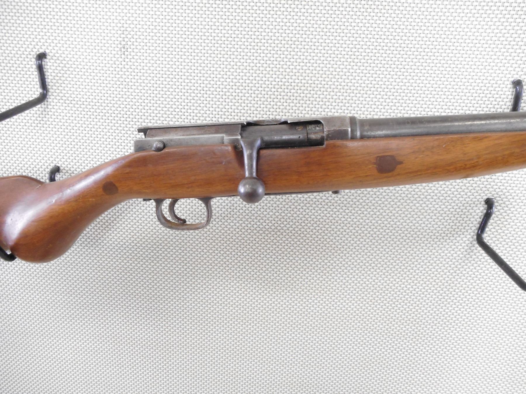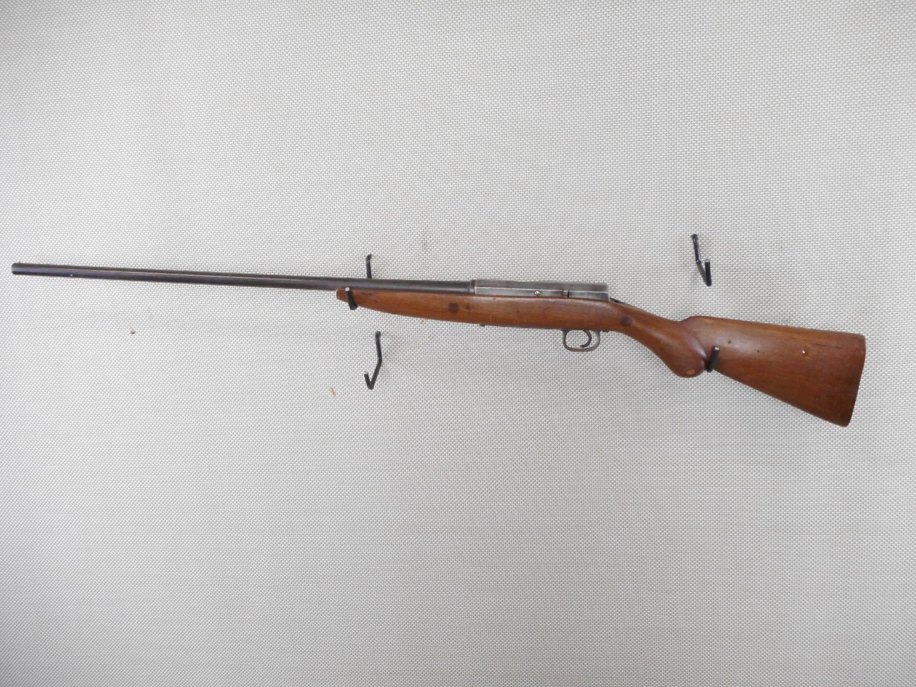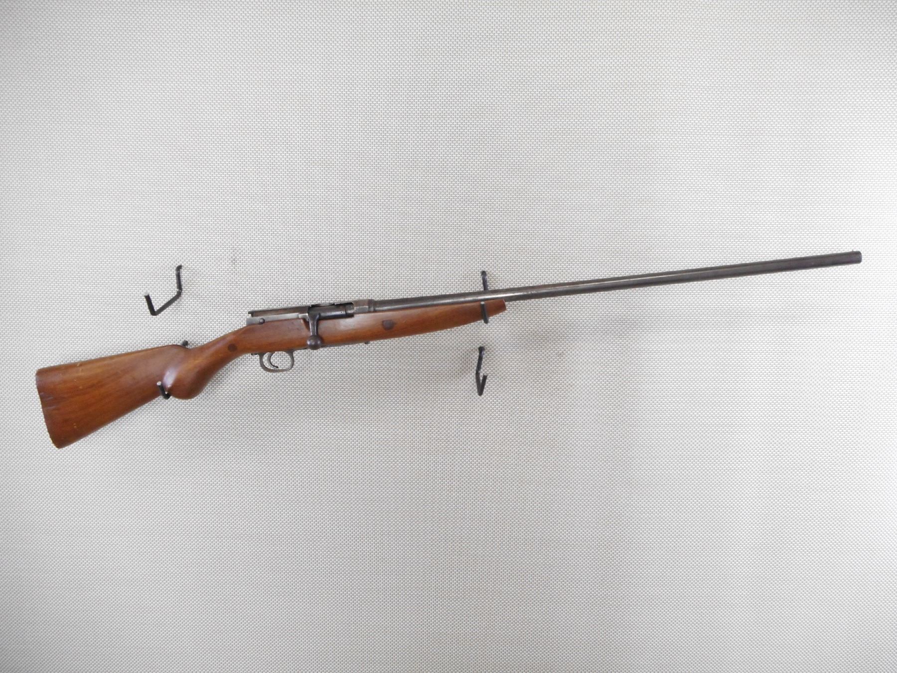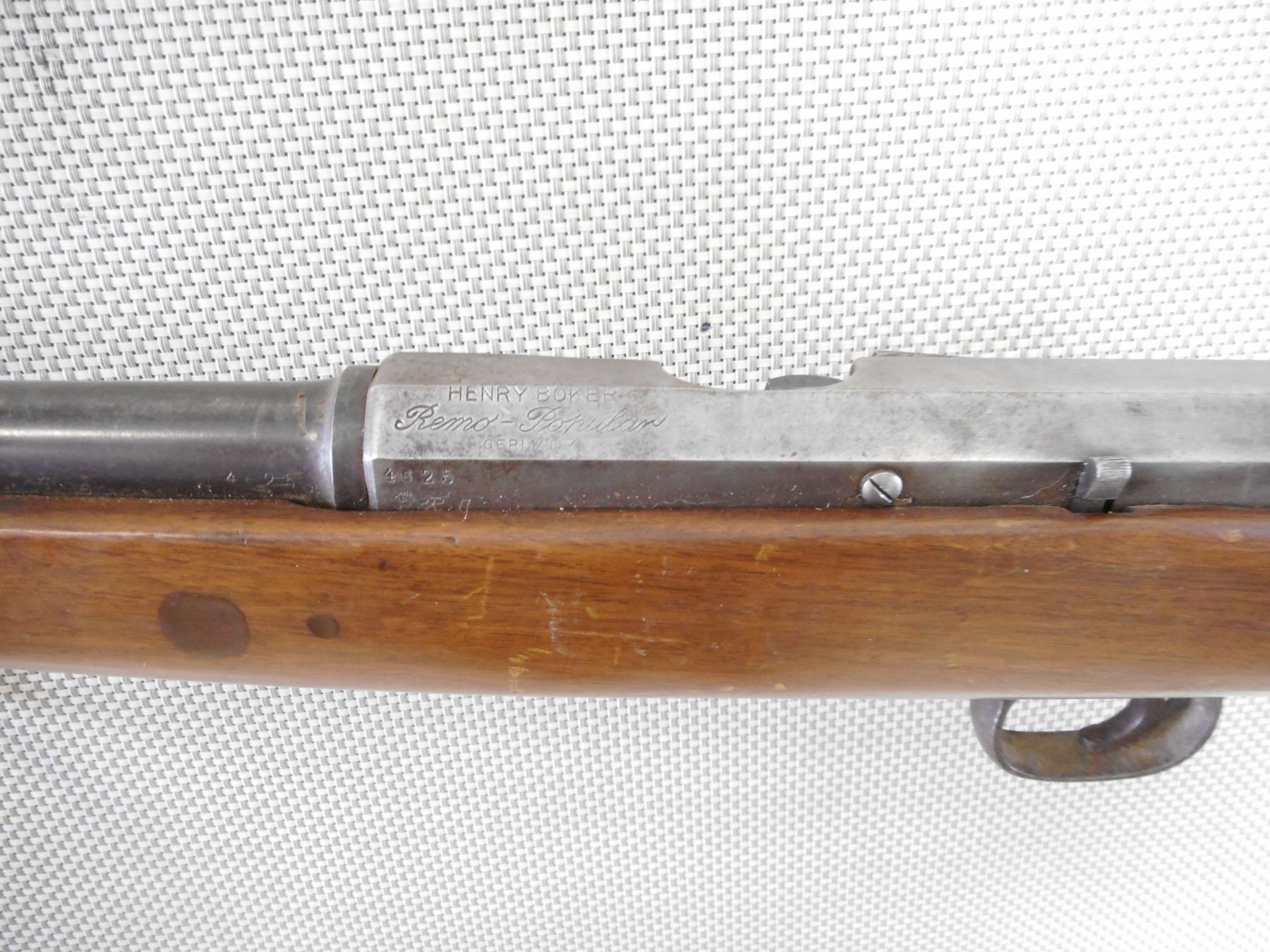 HENRY BOKER , MODEL: REMO POPULAR , CALIBER: 12GA X 2 3/4" , BORE IS GOOD. FIXED FULL CHOKE. BRASS BEAD FRONT SIGHT. ROUND BARREL WITH MARKS NEAR THE RECEIVER. OCTAGONAL RECEIVER MARKED DRP. WOOD STOCK SHOWS SEVERAL REPAIRS. CRACKED AT THE WRIST. NO BUTT PLATE. METAL FINISH IS SILVER GREY WITH LIGHT RUST SPECKLES. SHOWS NUMEROUS HANDLING MARKS AND WEAR. ACTION: BOLT ACTION SHOTGUN , BARREL LENGTH: 29 1/2" , SERIAL # 4625 , CONDITION: 3/10 , CLASS: CANADIAN NON RESTRICTED CLASS