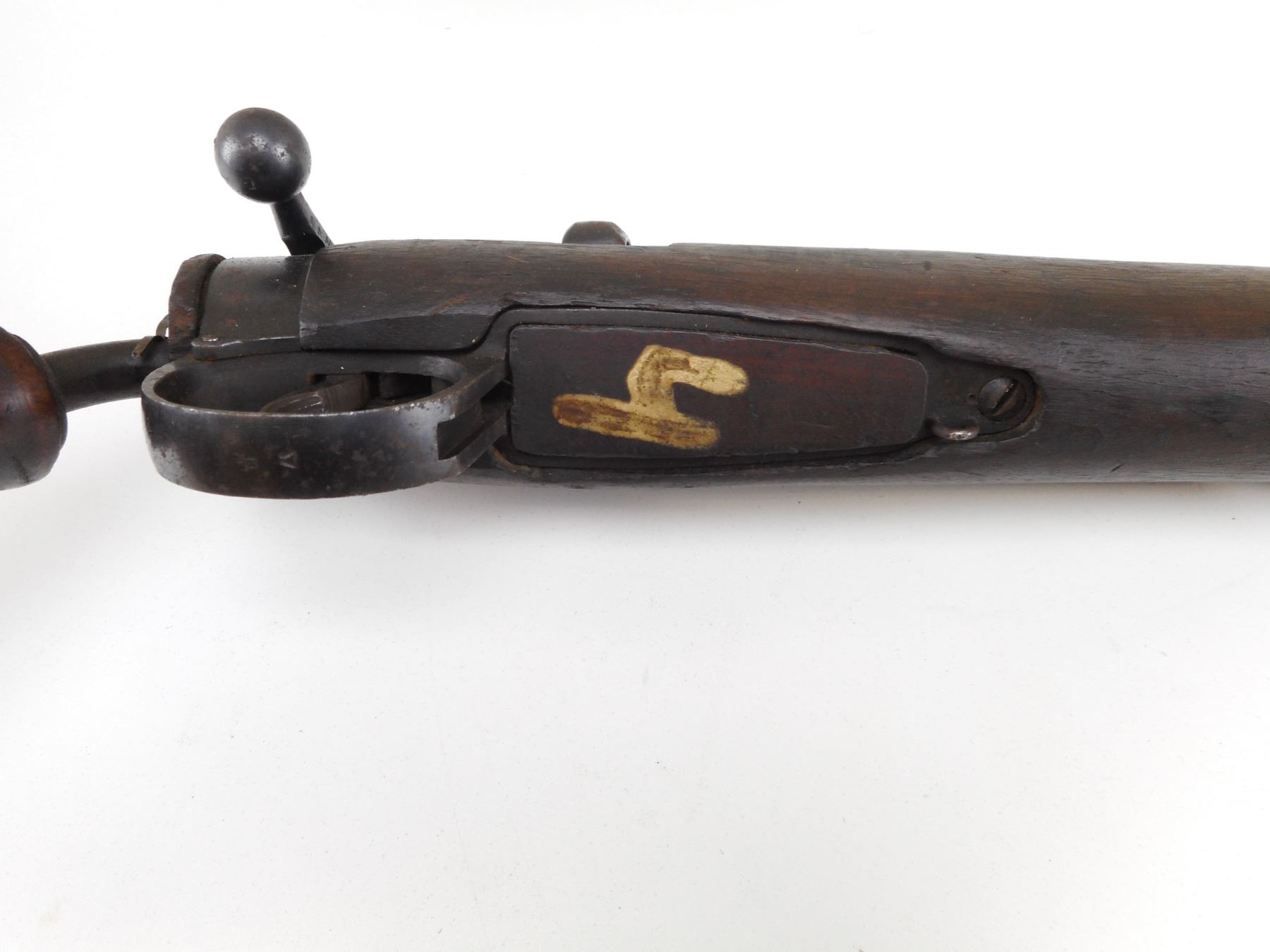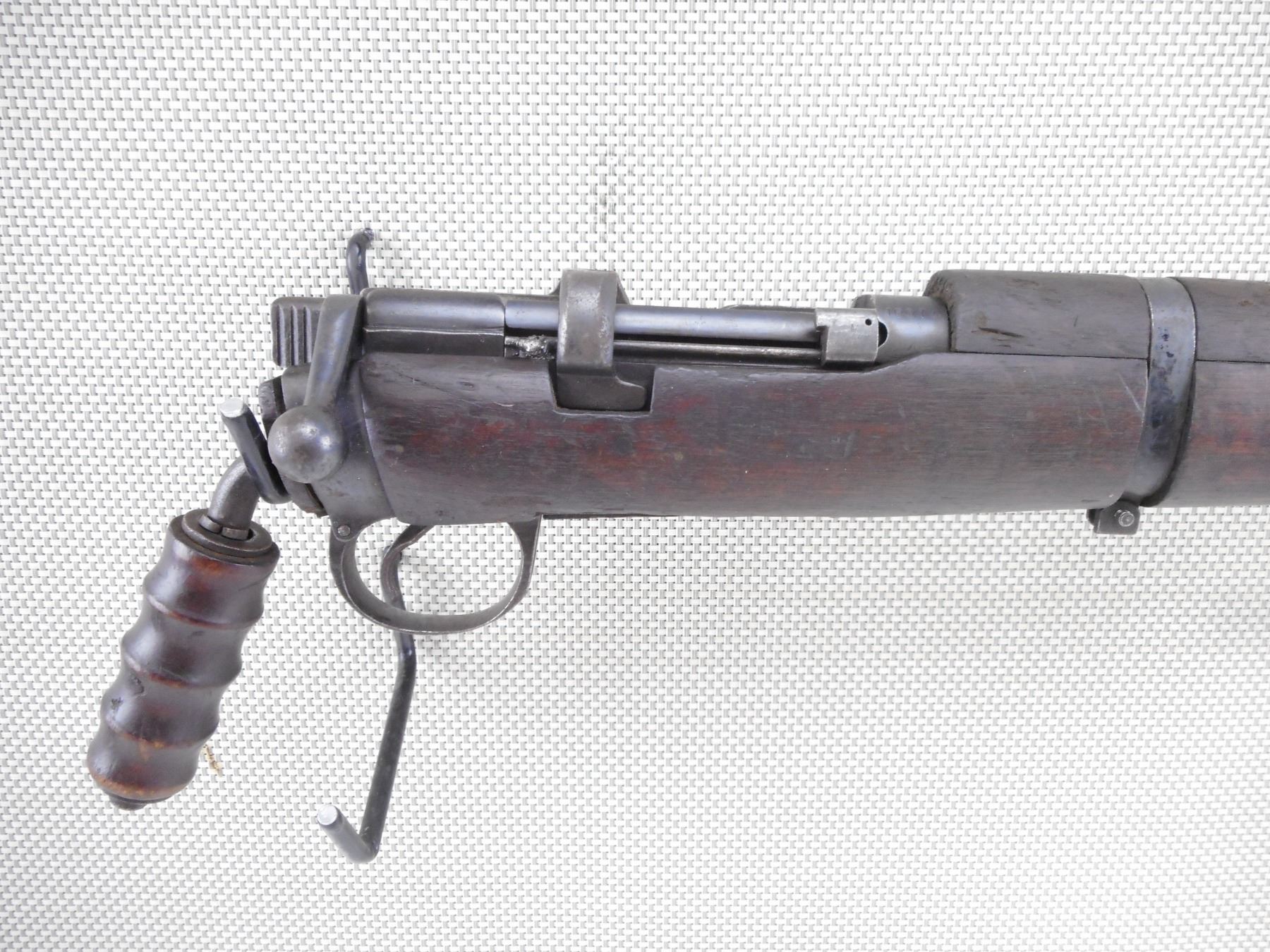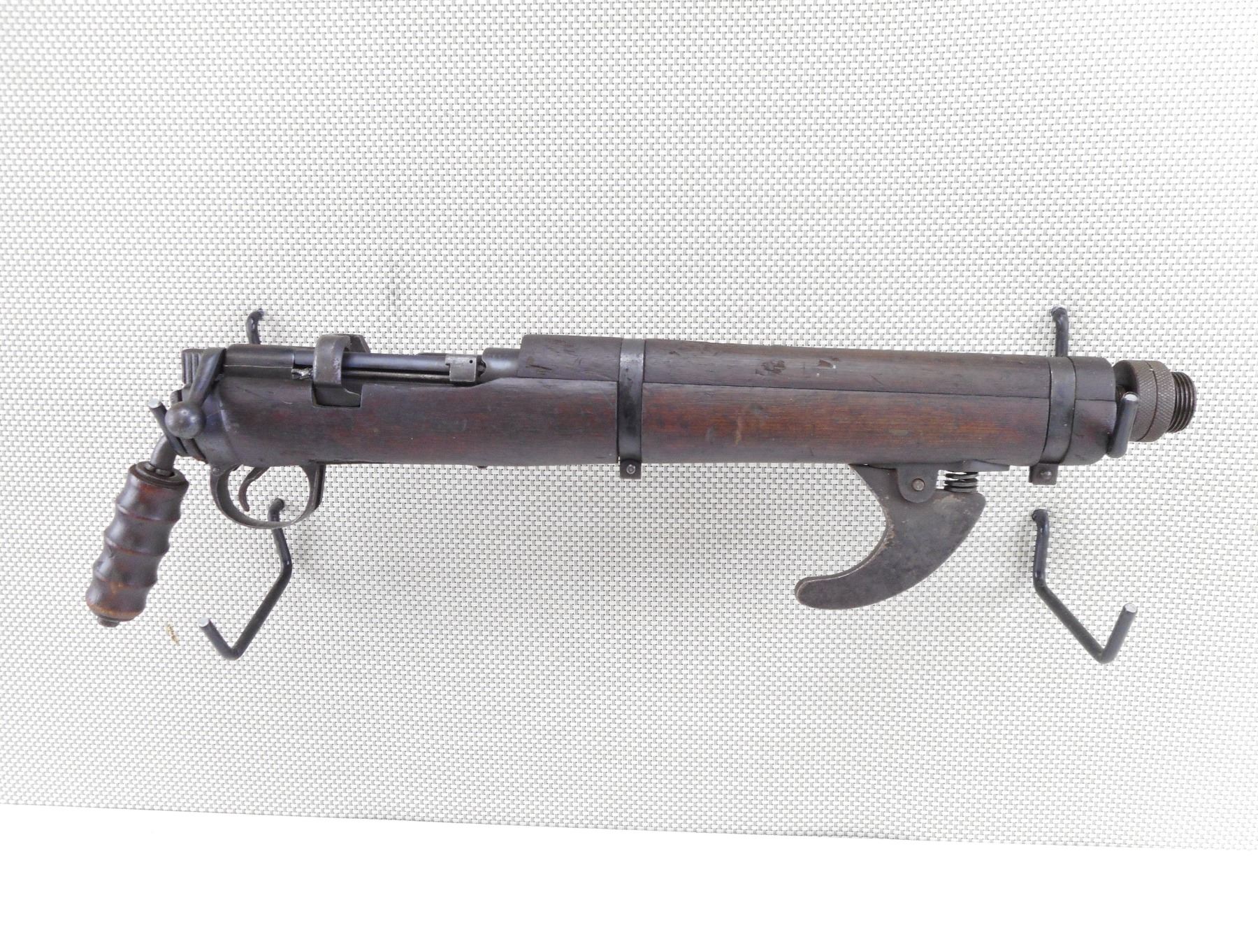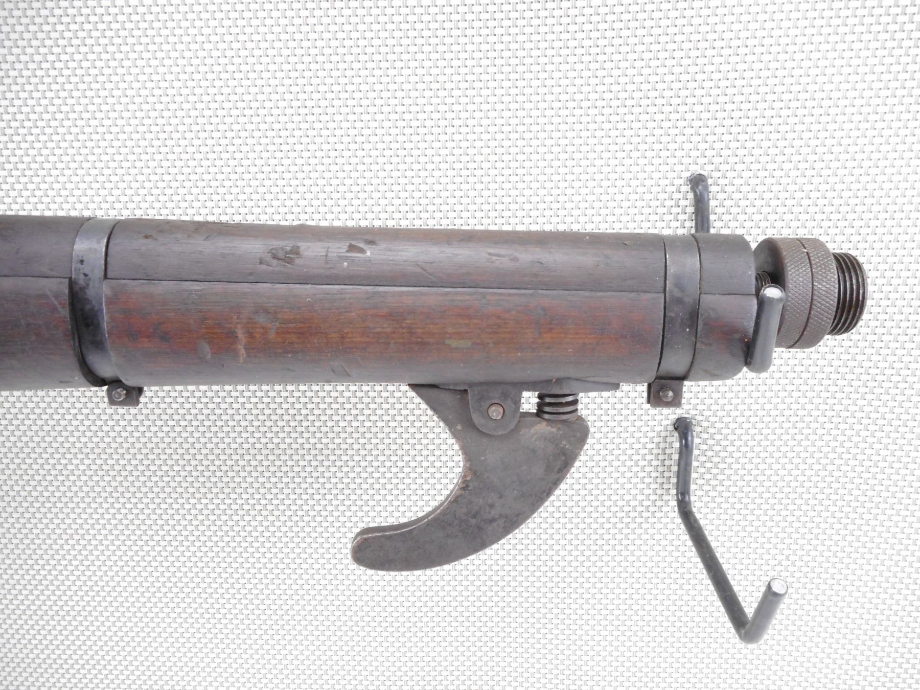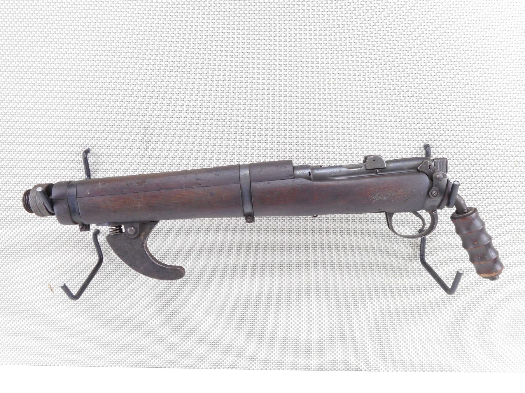 LEE ENFIELD , MODEL: ISHAPORE CARBINE SMOKE , CALIBER: 303 BR , DEACTIVATED. HAS SOME MILITARY PROOF MARKS. NO1 MKIII WITH ORIGINAL MARKINGS REMOVED. REBUILT AT RFI 1942 TO 410, CONVERTED BACK TO 303 BR AND MODIFIED AS A 2 1/2" SMOKE DISCHARGER. USED ON A SWIVEL MOUNT ON ARMOURED FIGHTING VEHICLES. STEEL HOOK ON FOREND. ADAPTER FOR CUP DISCHARGER. CUP DISCHARGER IS NOT PRESENT. WOOD PISTOL GRIP IS ATTACHED TO BUTT STOCKET. BARREL PINNED, FIRING HOLE PIN IS WELDED. BOLT IS NOT REMOVEABLE. SHOWS SOME HANDLING MARKS AND WEAR. ACTION: BOLT ACTION , BARREL LENGTH: 13 1/2" , SERIAL # 10074 , CONDITION: DEACTIVATED 6/10 , CLASS: NO LICENSE REQUIRED