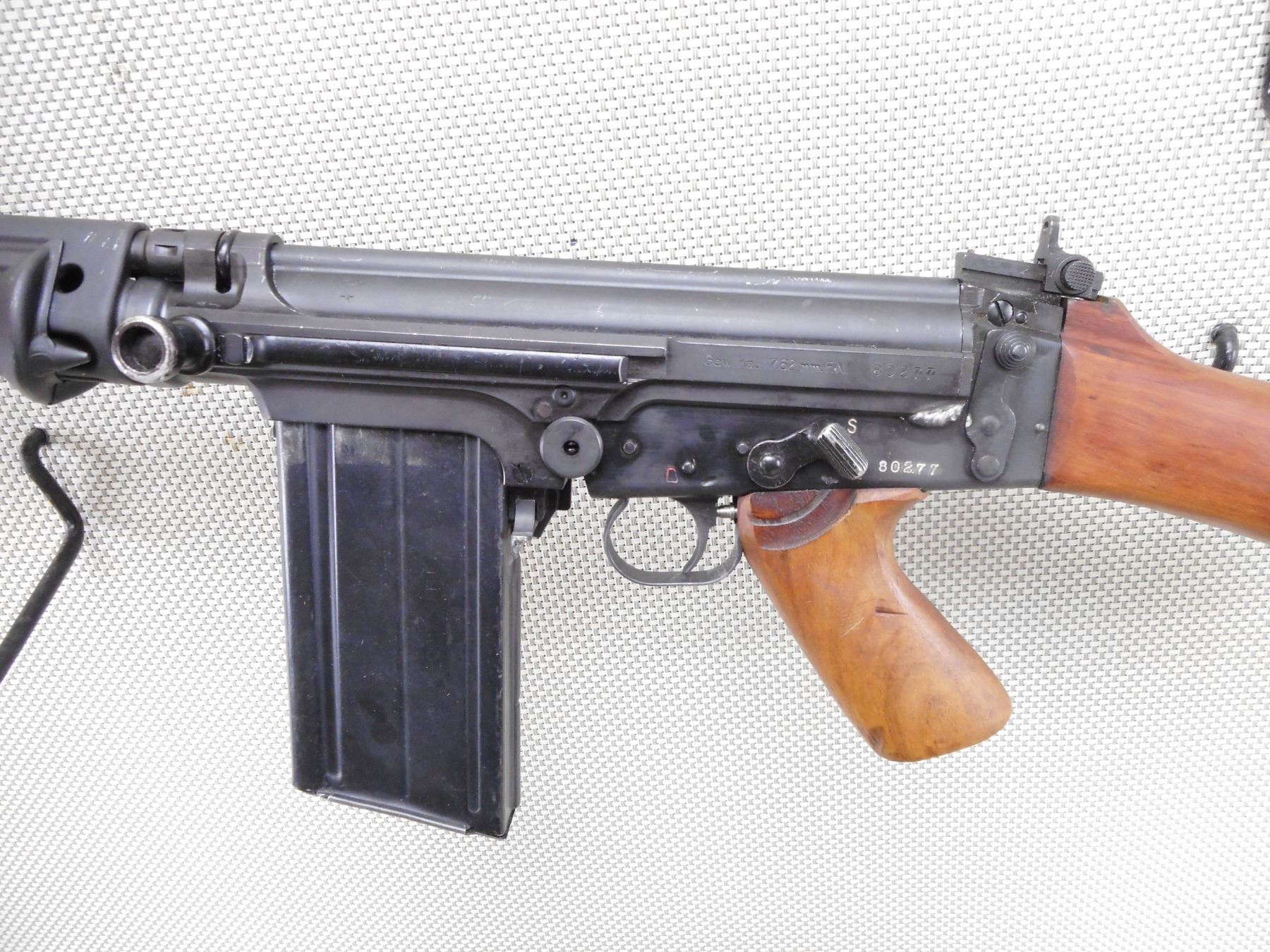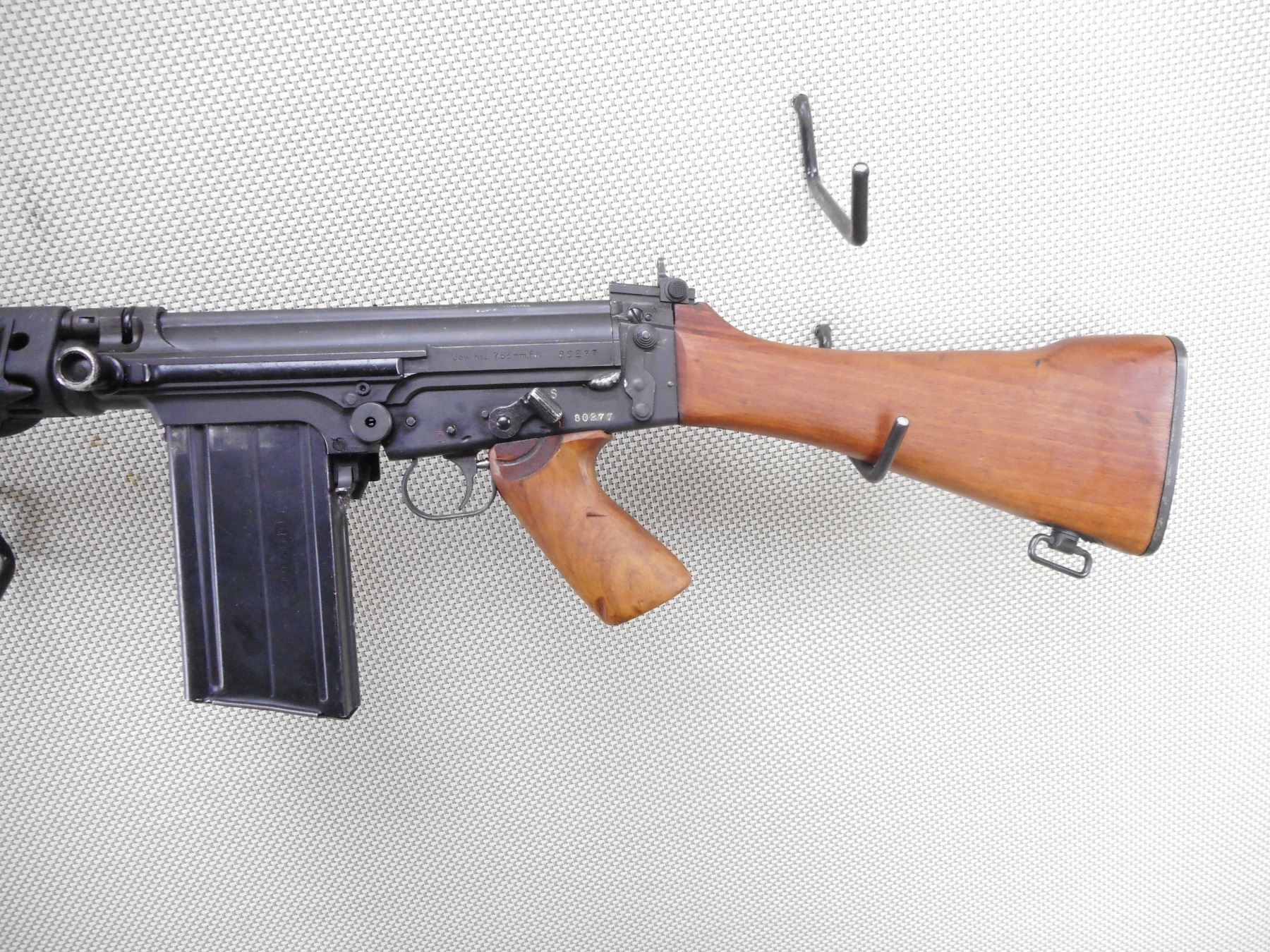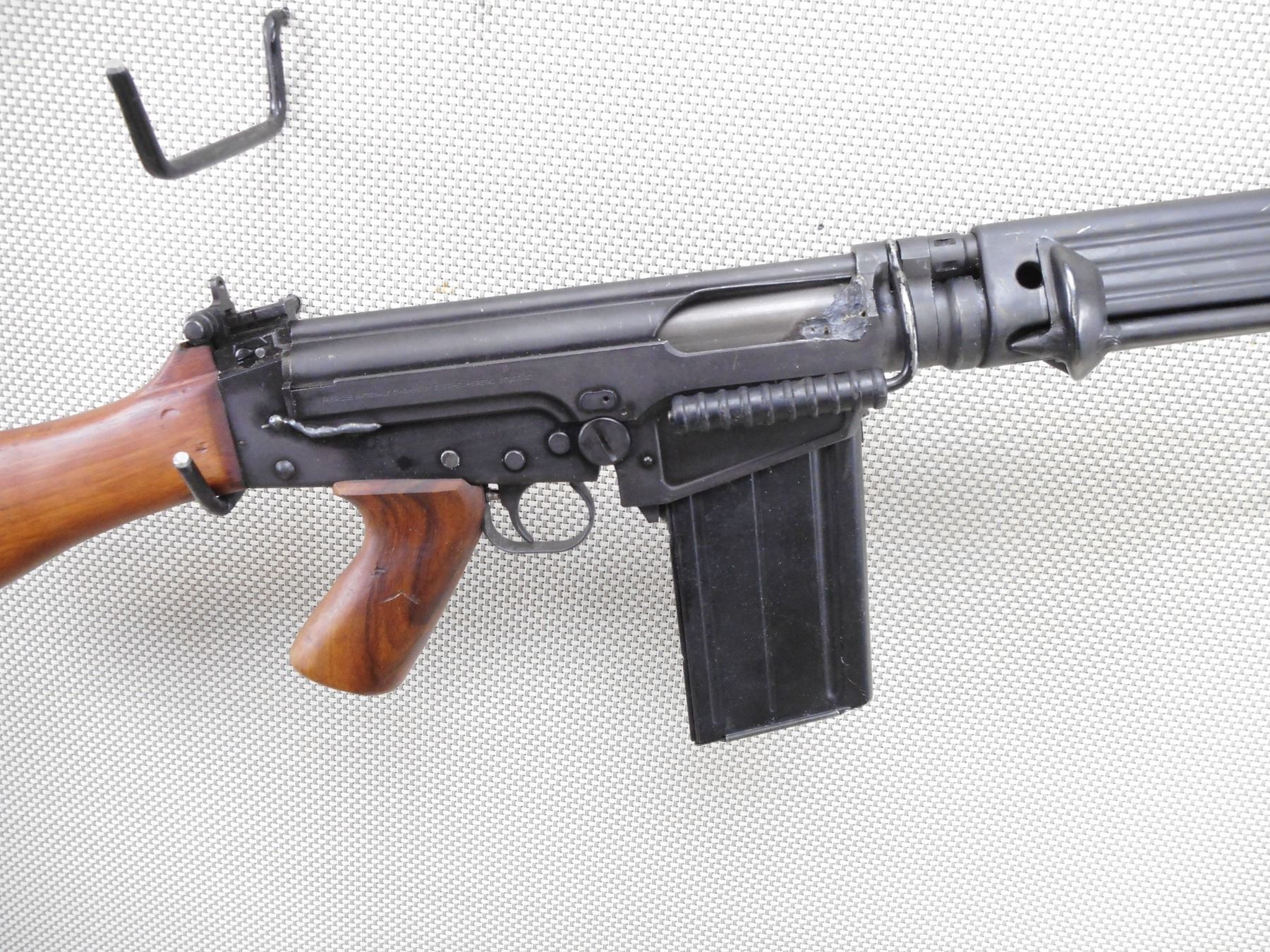 FN , MODEL: G1 , CALIBER: 7.62 NATO , DEACTIVATED. SERIAL #'S MATCHING. MANUFACTURED IN BELGIUM. DATED 4/58. BAYONET LUG ON THE BARREL. POST FRONT SIGHT WITH EARS. STEEL HANDGUARDS. FOLDING BIPOD. CARRYING HANDLE. ADJUSTABLE PEEP REAR SIGHT. WOOD PISTOL GRIP AND BUTT STOCK. STEEL BUTT PLATE. SWIVELS. MAGAZINE IS WELDED IN. ALL WELD MARKS ARE HIGHLY VISIBLE ON THE EXTERIOR OF THE FIREARM. SHOWS SOME HANLDING MARKS AND WEARACTION: SEMI AUTOMATIC RIFLE , BARREL LENGTH: 21" , SERIAL # 80277 , CONDITION: DEACTIVATED 6/10 , CLASS: NO LICENSE REQUIRED