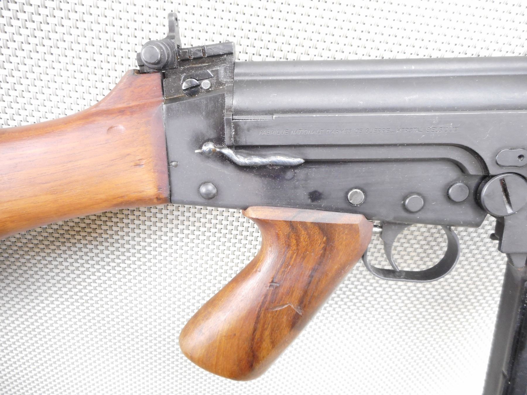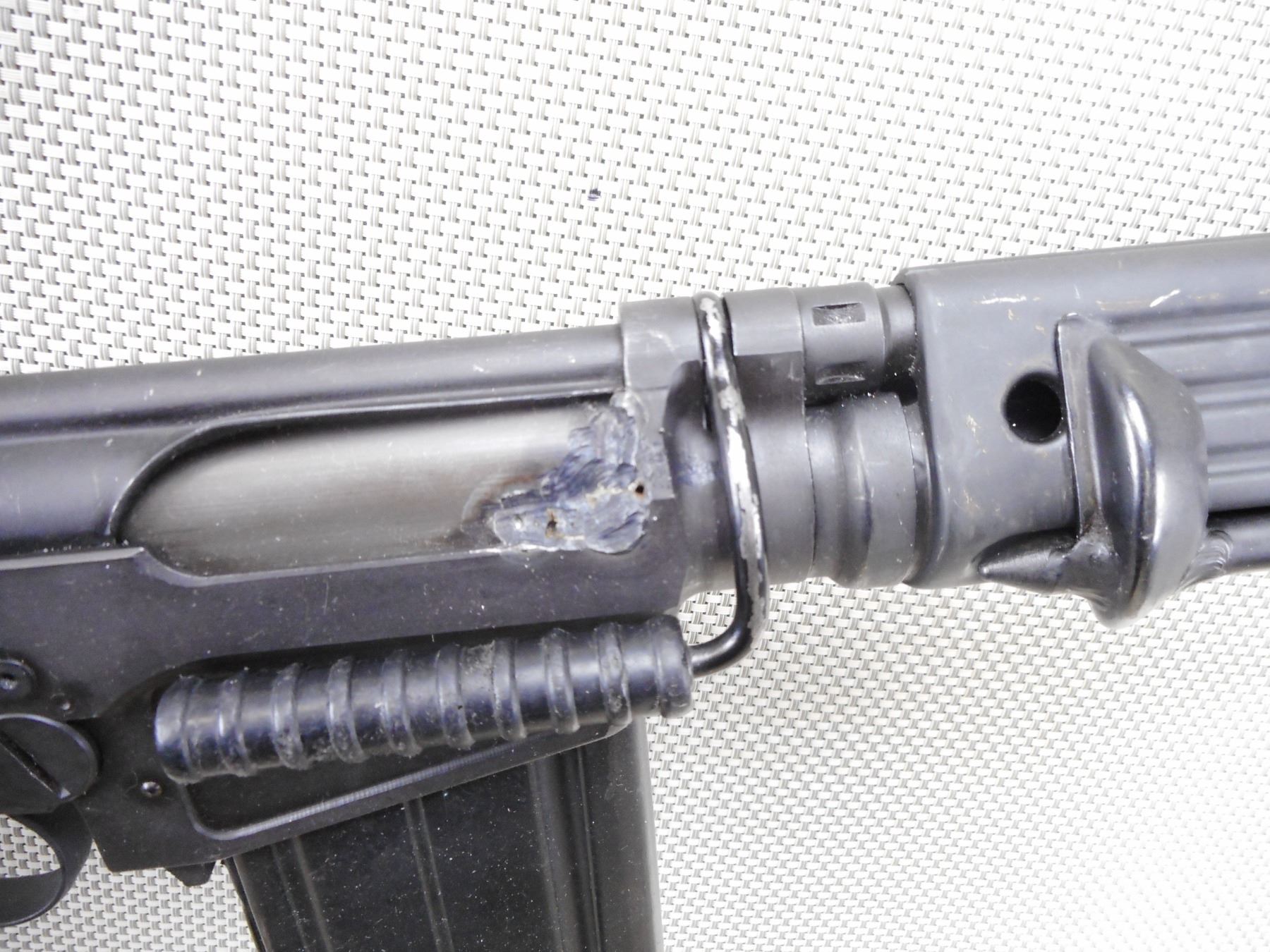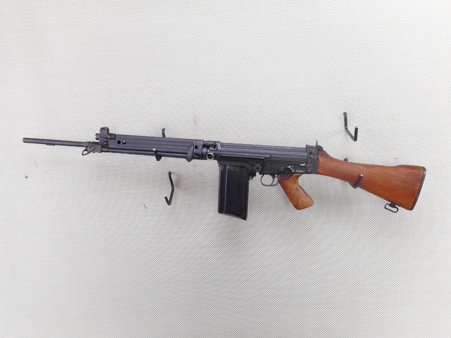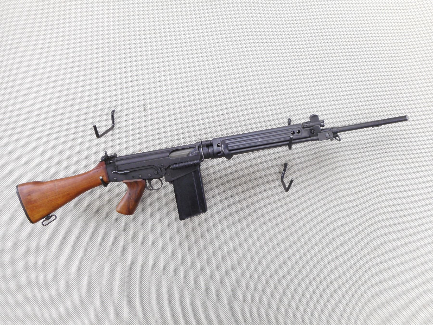 FN , MODEL: G1 , CALIBER: 7.62 NATO , DEACTIVATED. SERIAL #'S MATCHING. MANUFACTURED IN BELGIUM. DATED 4/58. BAYONET LUG ON THE BARREL. POST FRONT SIGHT WITH EARS. STEEL HANDGUARDS. FOLDING BIPOD. CARRYING HANDLE. ADJUSTABLE PEEP REAR SIGHT. WOOD PISTOL GRIP AND BUTT STOCK. STEEL BUTT PLATE. SWIVELS. MAGAZINE IS WELDED IN. ALL WELD MARKS ARE HIGHLY VISIBLE ON THE EXTERIOR OF THE FIREARM. SHOWS SOME HANLDING MARKS AND WEARACTION: SEMI AUTOMATIC RIFLE , BARREL LENGTH: 21" , SERIAL # 80277 , CONDITION: DEACTIVATED 6/10 , CLASS: NO LICENSE REQUIRED