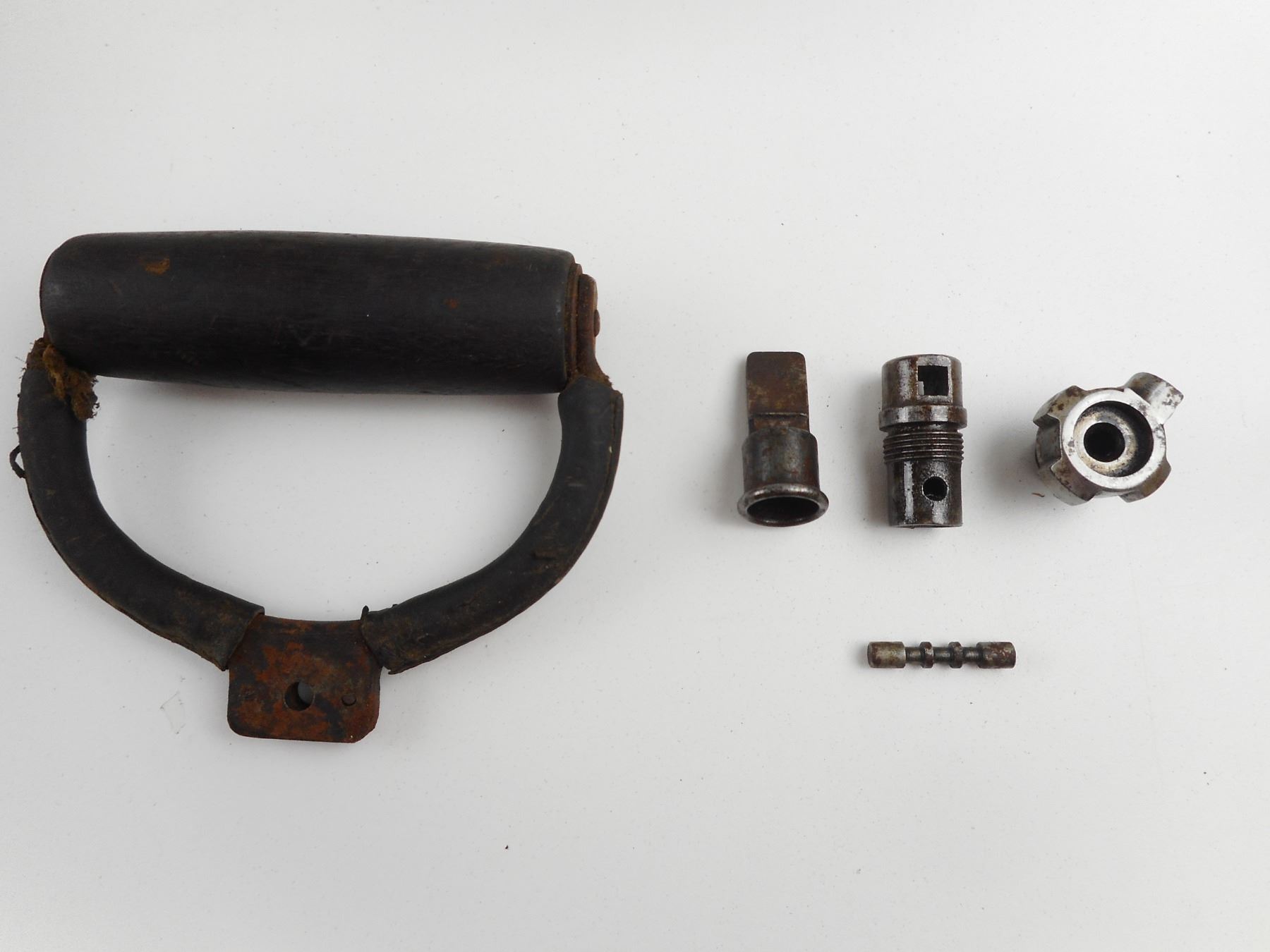 WWI BRITISH LEWIS .303 MG PARTS , (1) COCKING HANDLE (1) GAS REGULATOR (1) FEED ARM ACTUATING STUD (1) BODY LOCKING PIN (1) CARRYING HANDLE (NO BRACKET). SEE PHOTO CLASS: NO LICENSE REQUIRED