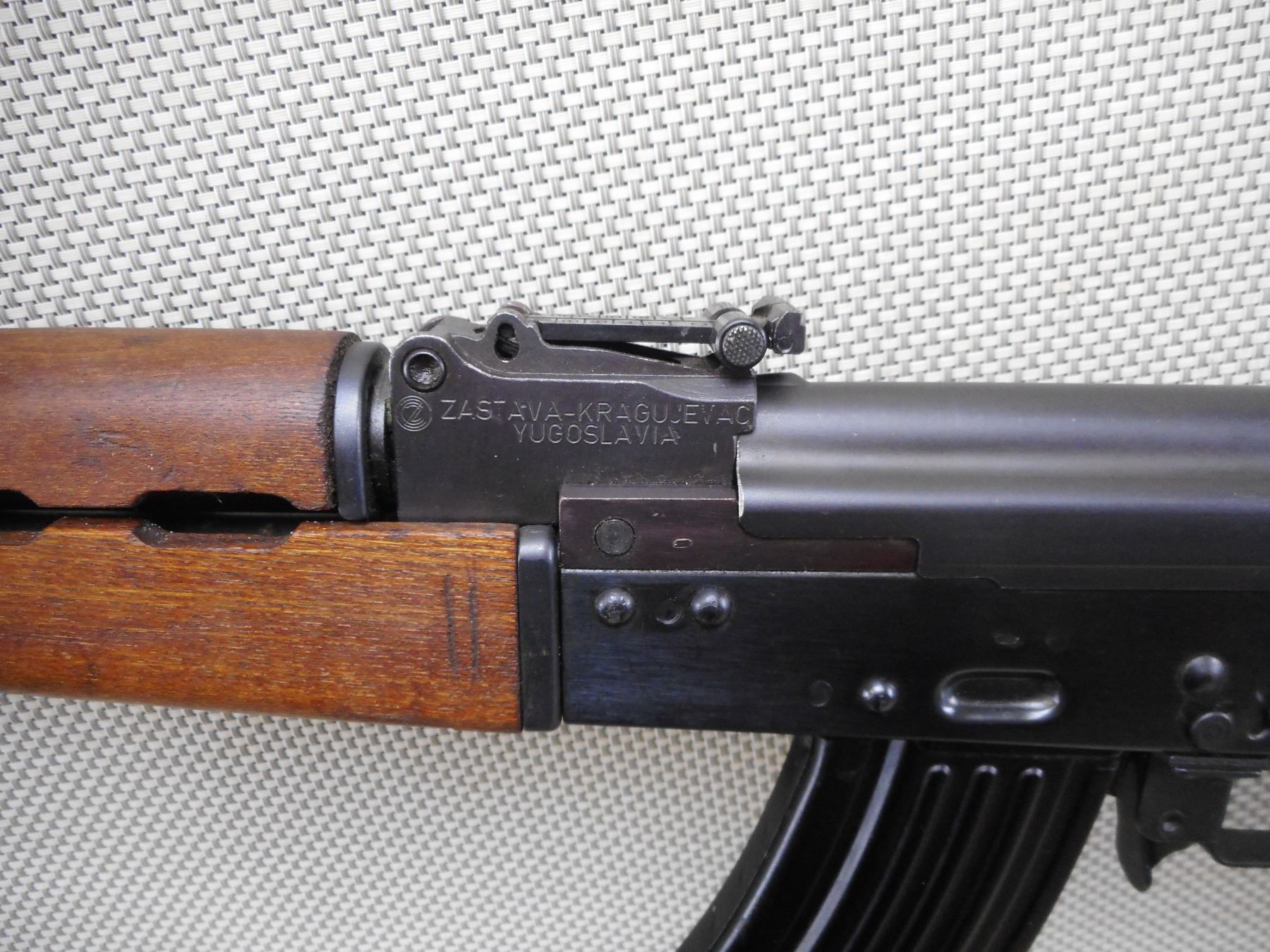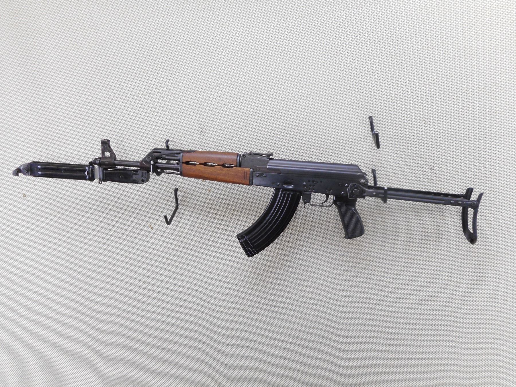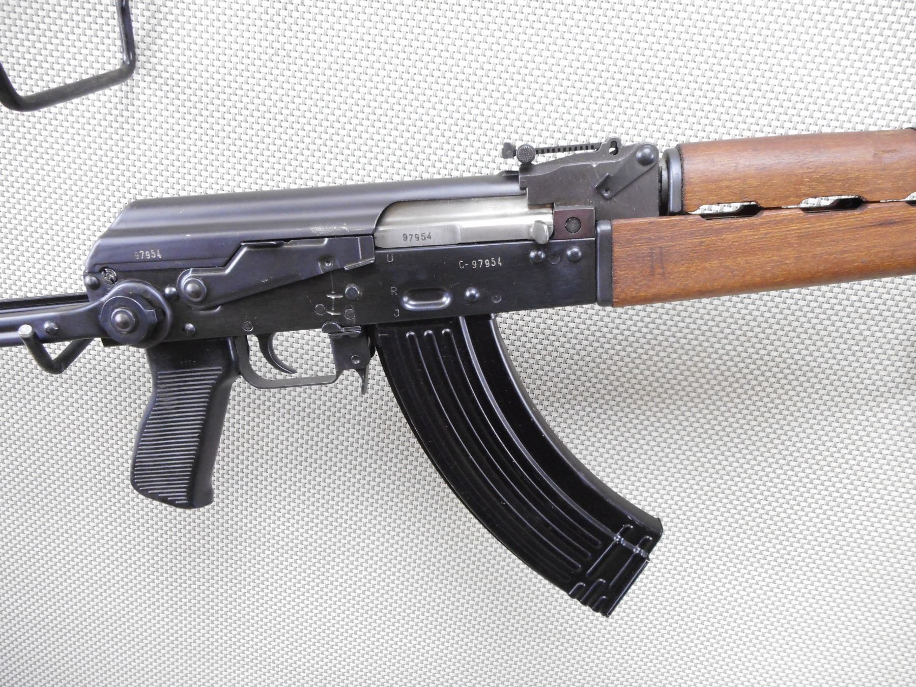 ZASTAVA , MODEL: M70AB2 , CALIBER: 7.62X39 RUSSIAN , COMES WITH BLADE BAYONET AND SCABBARD AS WELL AS A MAGAZINE, VISIBLE SERIAL #'S MATCH, NOT DATED, HAS POST FRONT SIGHT, ADJUSTABLE U NOTCH REAR SIGHT, WOOD FOREND AND HAND GUARD, STEEL FOLDING BUTT STOCK, SERRATED BLACK POLYMER PISTOL GRIP, CLEANING ROD, GRENADE LAUNCHING SIGHT ON TOP OF GAS BLOCK, BLUED FINISH ON METAL PARTS, SHOWS SOME HANDLING MARKS AND WEAR. DEACTIVATED. BOLT DOES NOT MOVE AND MAGAZINE IS NOT REMOVEABLE. CAN'T BE DISASSEMBLED. ACTION: RIFLE/ CONVERTED AUTO , BARREL LENGTH: 415MM , SERIAL # C97954 , CONDITION: DEACTIVATED 7/10 , CLASS: NO LICENSE REQUIRED