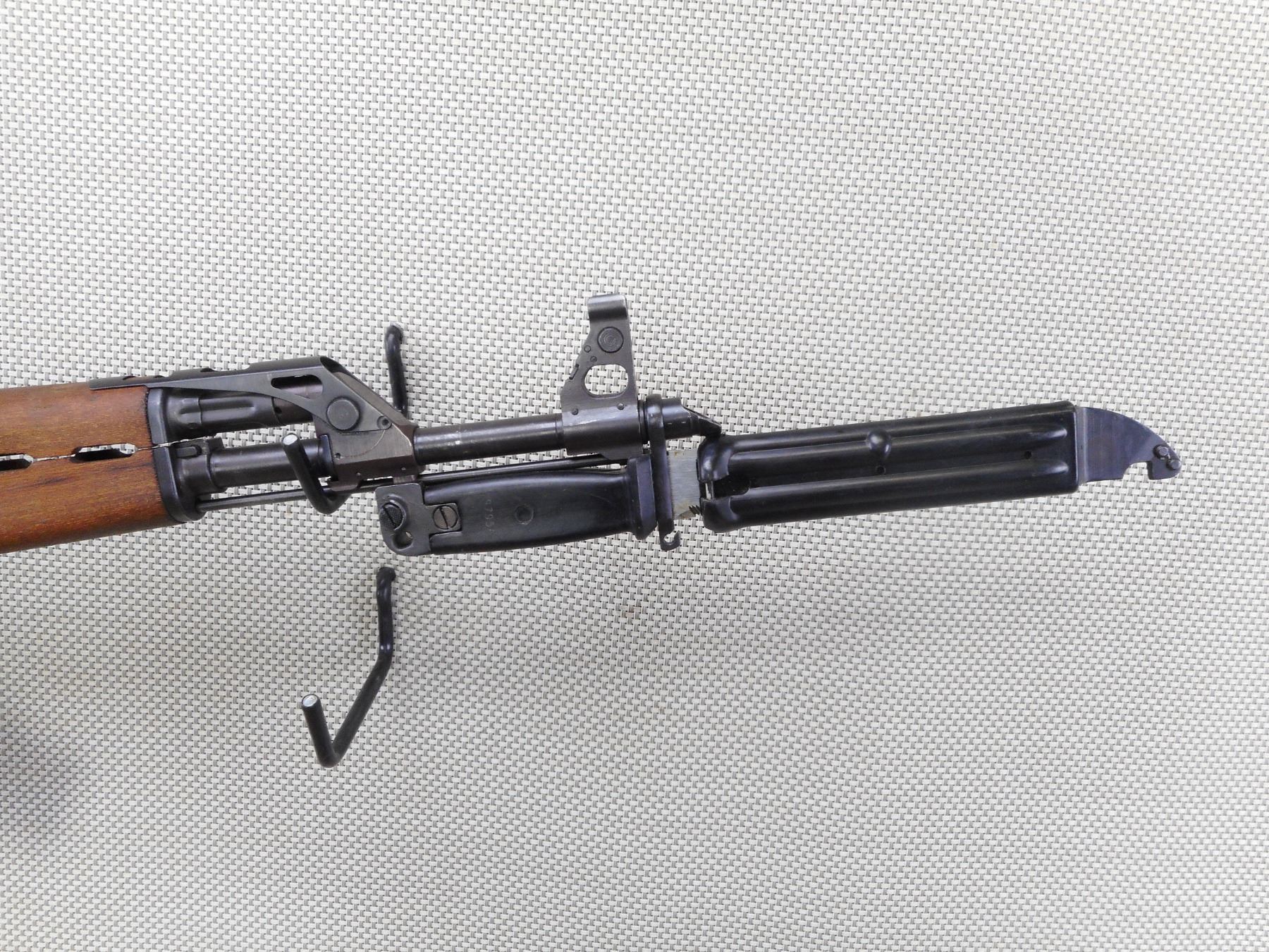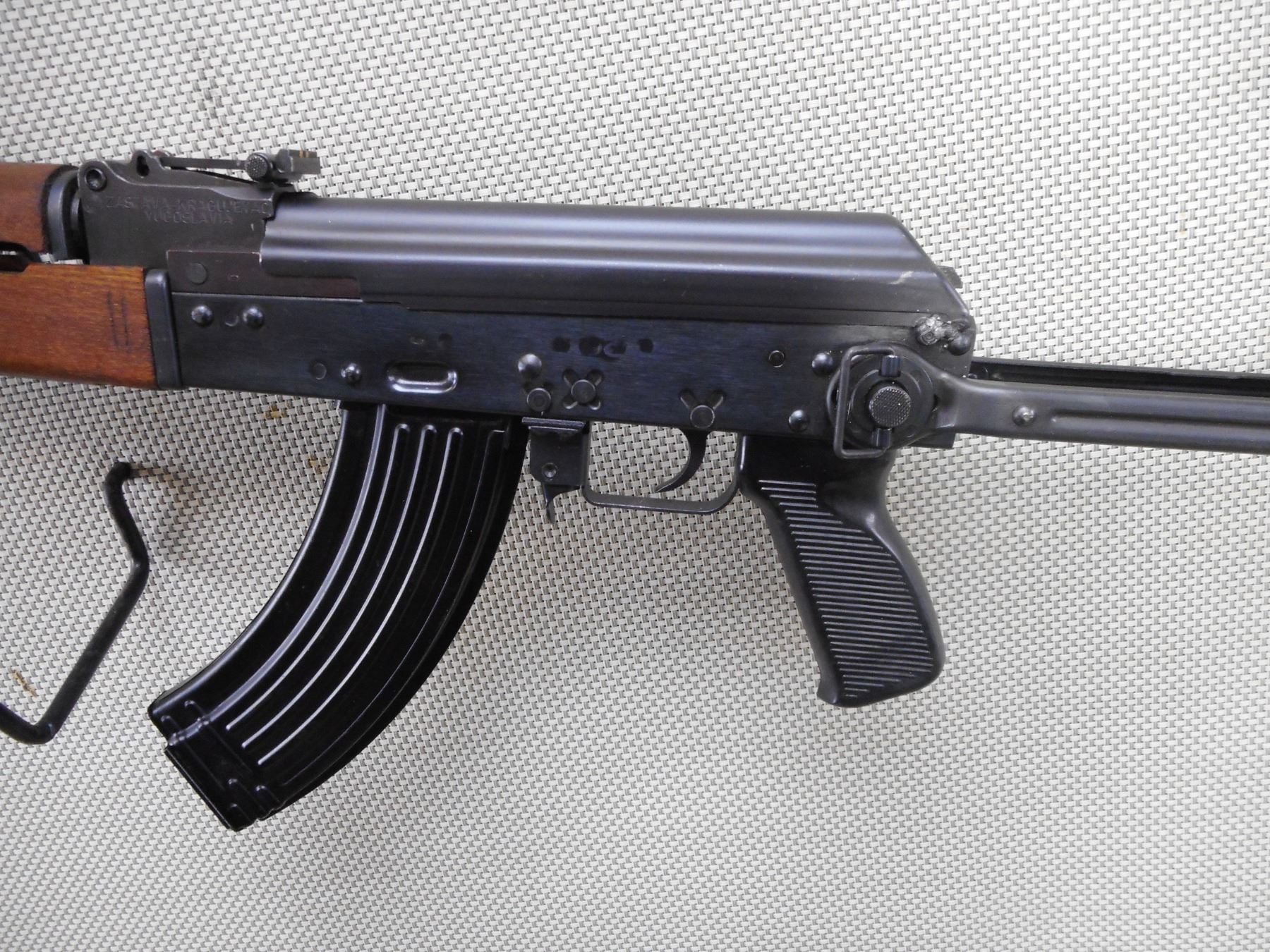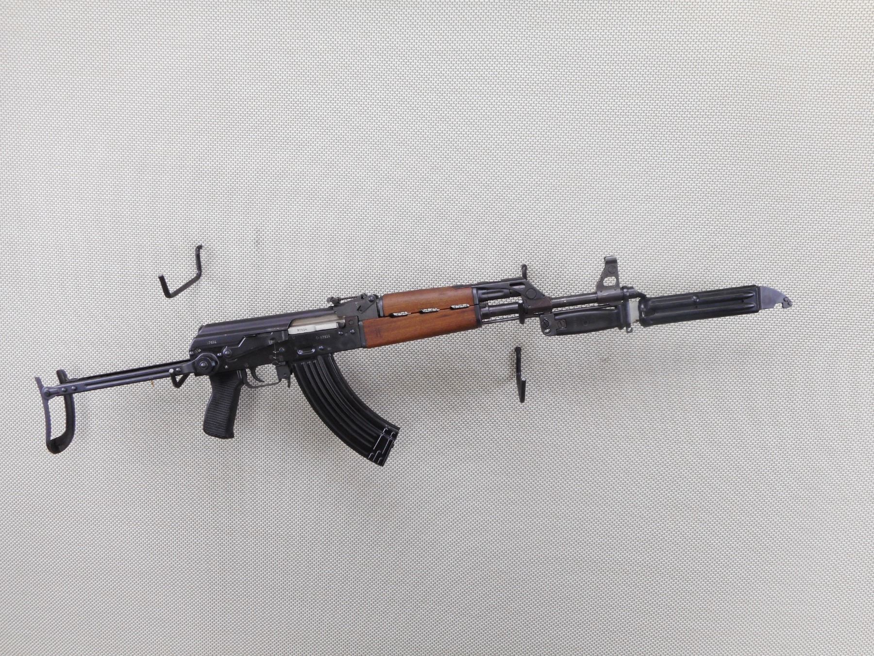 ZASTAVA , MODEL: M70AB2 , CALIBER: 7.62X39 RUSSIAN , COMES WITH BLADE BAYONET AND SCABBARD AS WELL AS A MAGAZINE, VISIBLE SERIAL #'S MATCH, NOT DATED, HAS POST FRONT SIGHT, ADJUSTABLE U NOTCH REAR SIGHT, WOOD FOREND AND HAND GUARD, STEEL FOLDING BUTT STOCK, SERRATED BLACK POLYMER PISTOL GRIP, CLEANING ROD, GRENADE LAUNCHING SIGHT ON TOP OF GAS BLOCK, BLUED FINISH ON METAL PARTS, SHOWS SOME HANDLING MARKS AND WEAR. DEACTIVATED. BOLT DOES NOT MOVE AND MAGAZINE IS NOT REMOVEABLE. CAN'T BE DISASSEMBLED. ACTION: RIFLE/ CONVERTED AUTO , BARREL LENGTH: 415MM , SERIAL # C97954 , CONDITION: DEACTIVATED 7/10 , CLASS: NO LICENSE REQUIRED