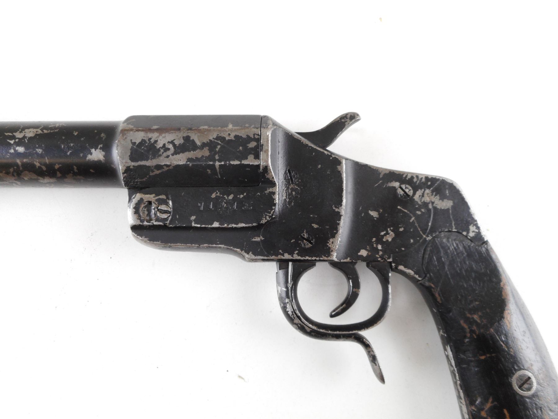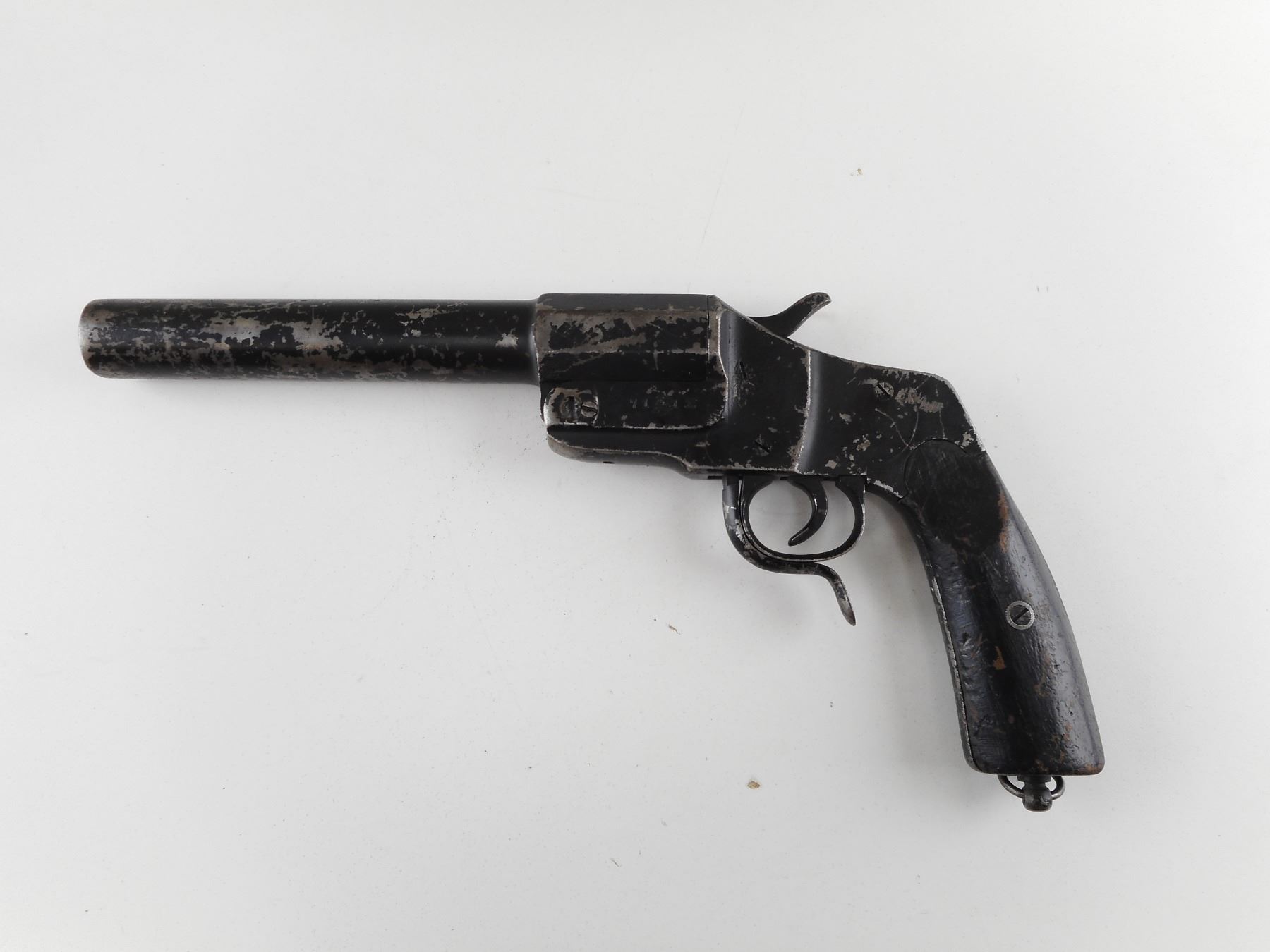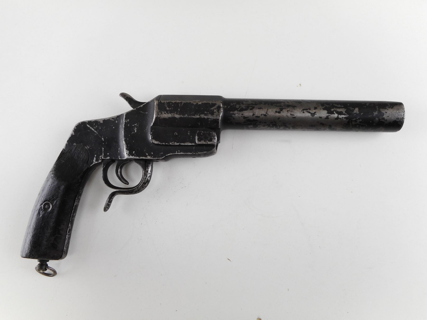 GERMAN HEBEL FLARE PISTOL , MODEL 1894 SERIAL # 7141. 26.5MM. IMPERIAL GERMAN PROOFED. 9" BARREL. BEEN PAINTED. BROKEN MAINSPRING. REPLACED WOOD GRIP PANELS. LANYARD LOOP. SHOWS EXTENSIVE HANDLING MARKS. CLASS: NO LICENSE REQUIRED