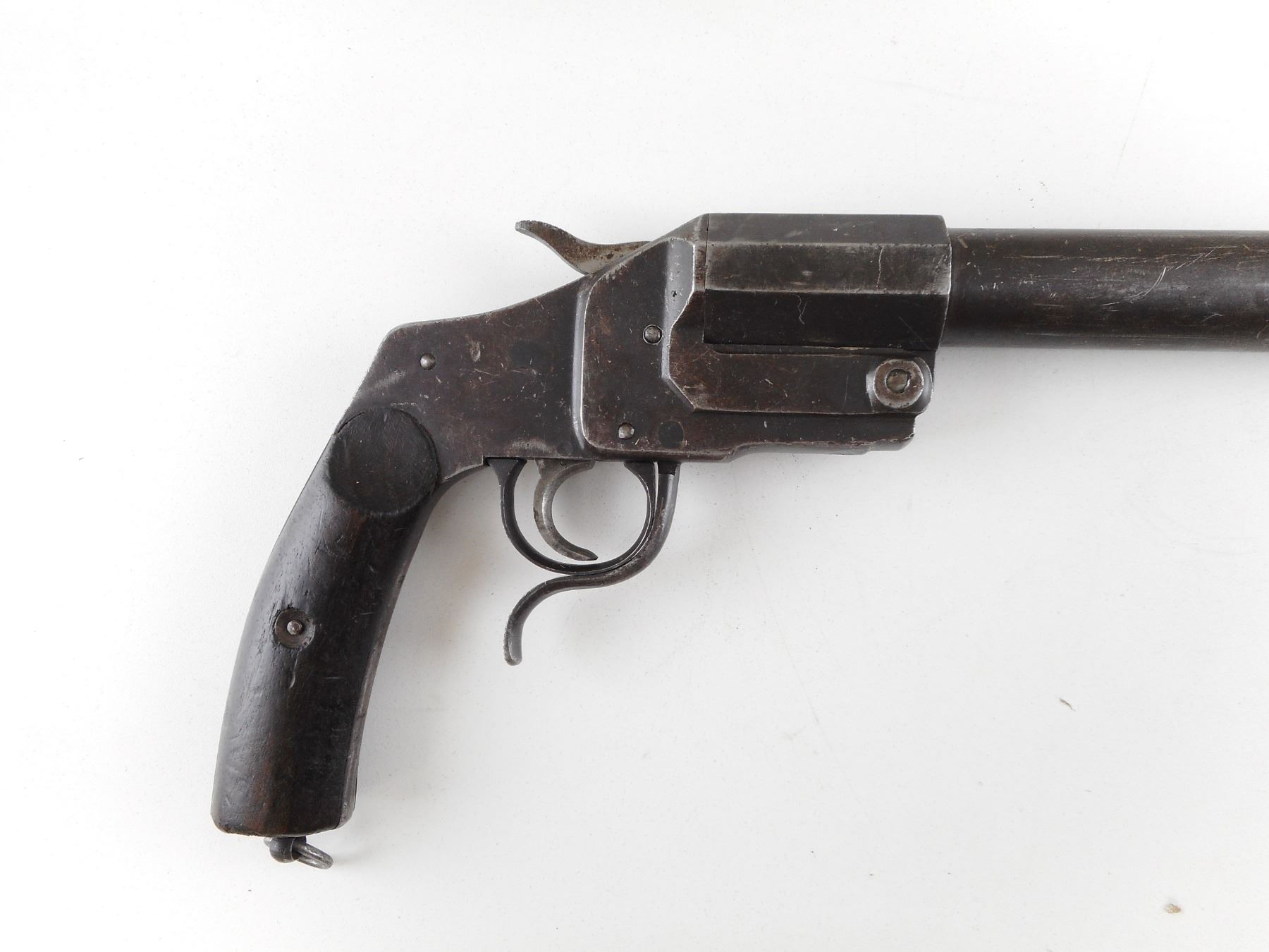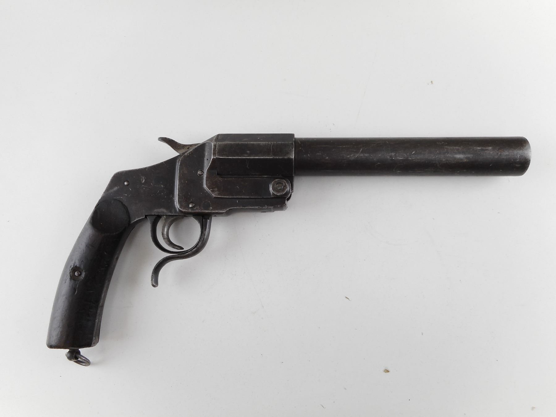 WWI GERMAN HEBEL FLARE GUN , 1894 FLARE PISTOL UNIT MARKED. 9" BARREL. CALIBER 26.5MM. DATED 1918. SERIAL # 85075. ALL STEEL CONSTRUCTION WITH ORIGINAL WOOD GRIPS. LANYARD LOOP. SHOWS SOME HANDLING MARKS. CLASS: NO LICENSE REQUIRED