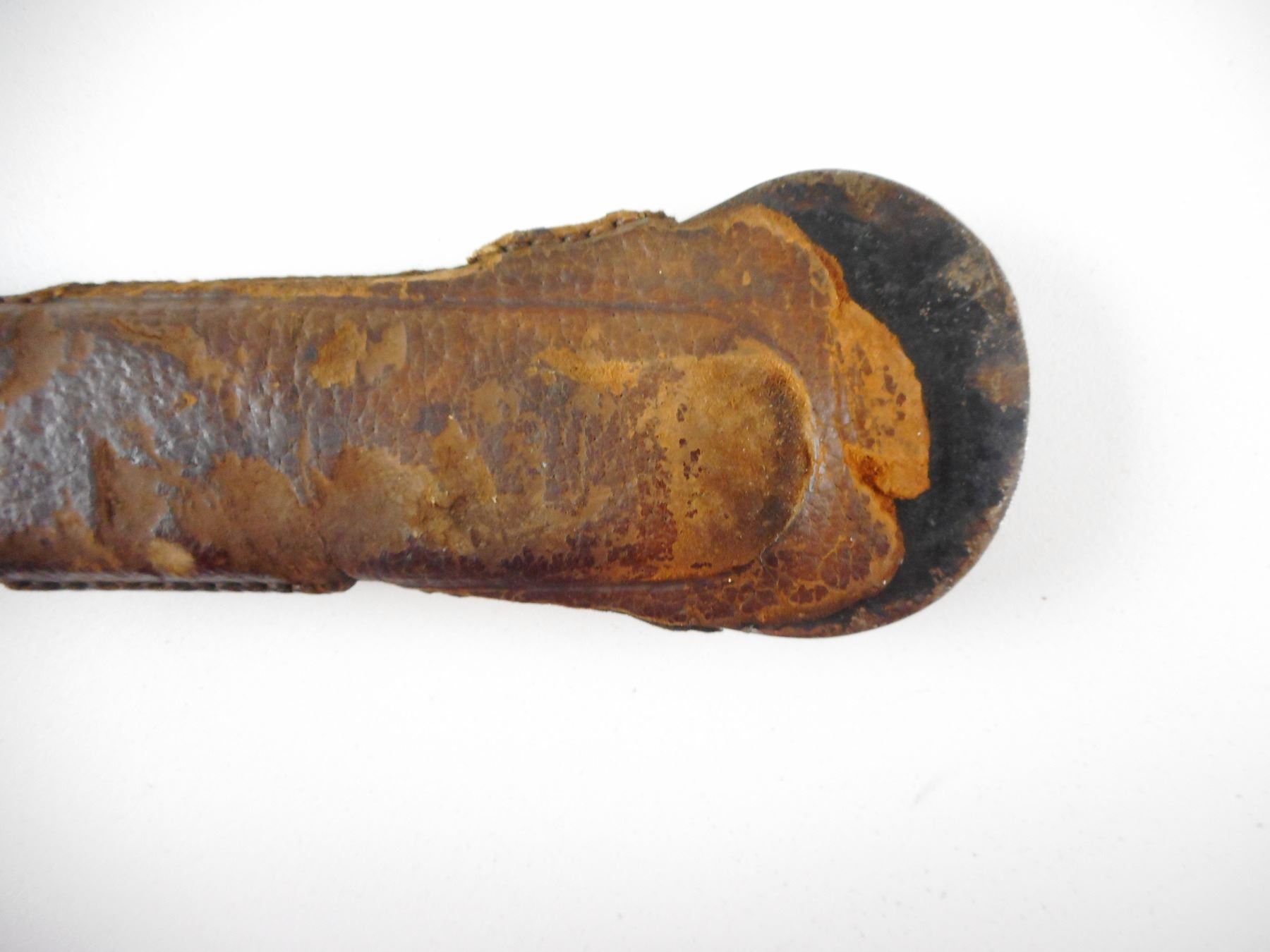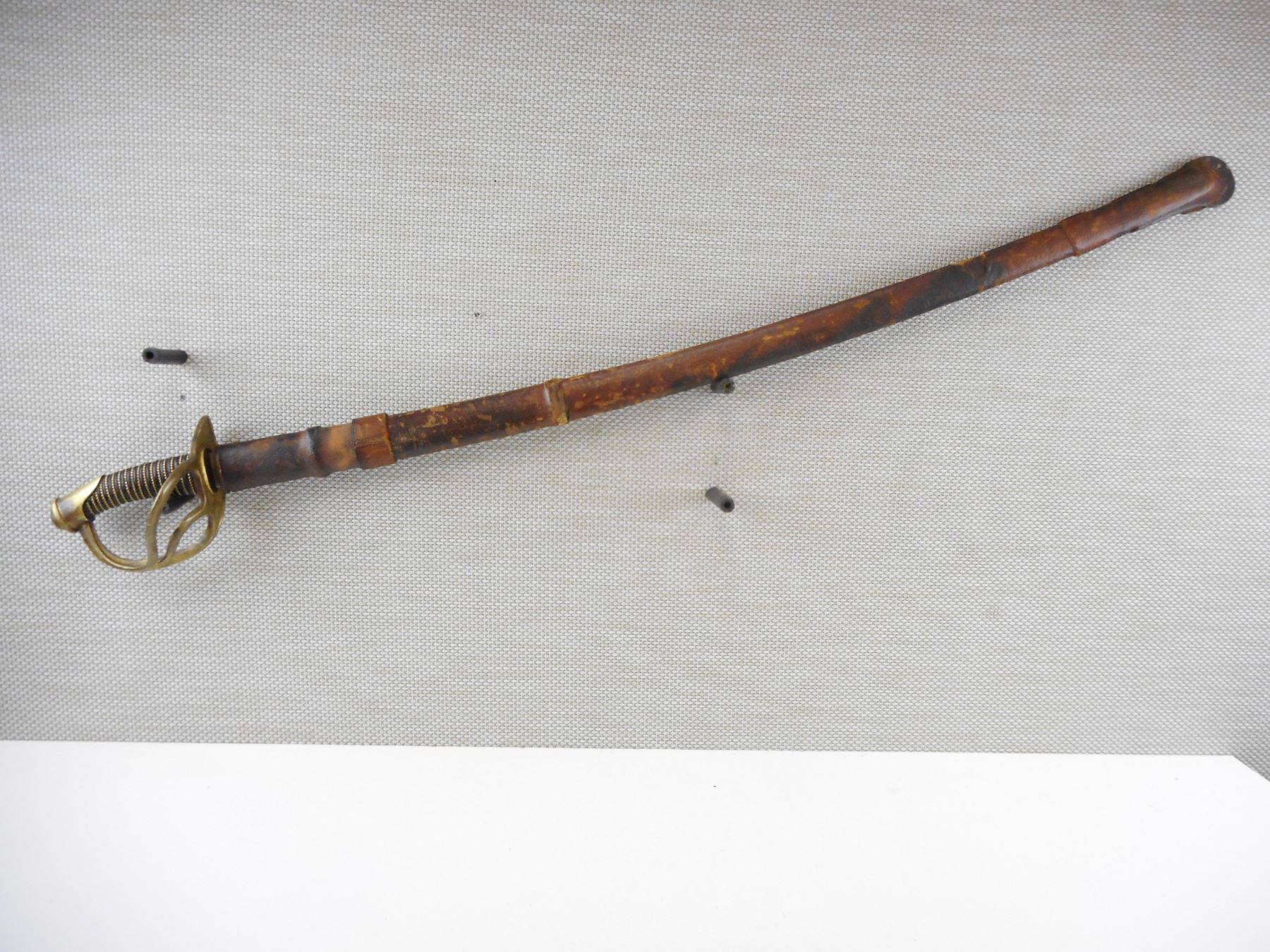 US 1840 PATTERN CAVALRY SWORD AND SCABBARD , ORIGINAL BLADE POLISH, NO VISIBLE MARKINGS. ORIGINAL GRIP WIRE COVERING, NO VISIBLE MARKINGS. RARE LEATHER COVERED STEEL SCABBARD, NO VISIBLE MARKINGS.