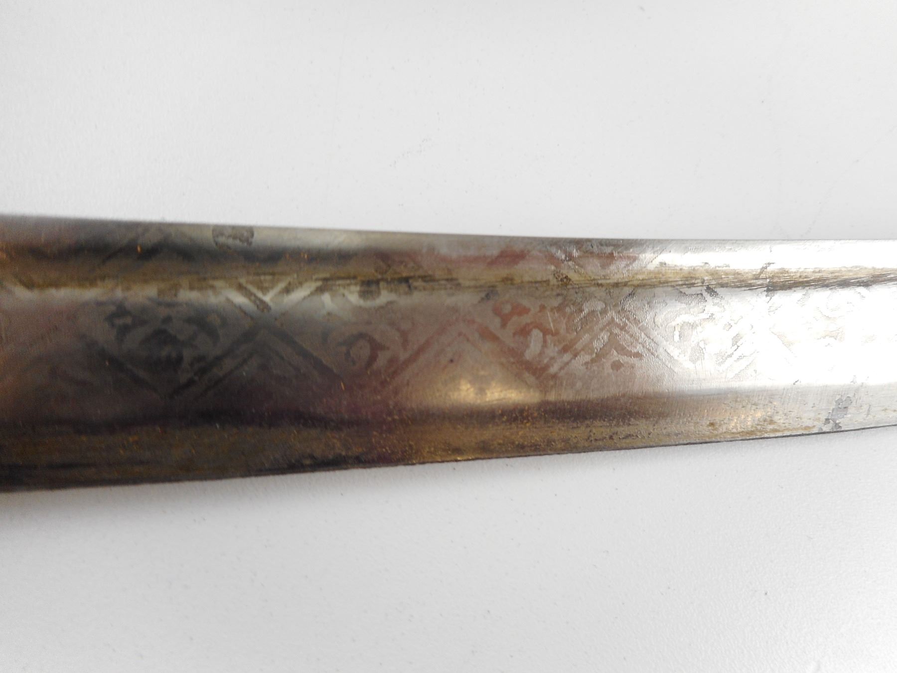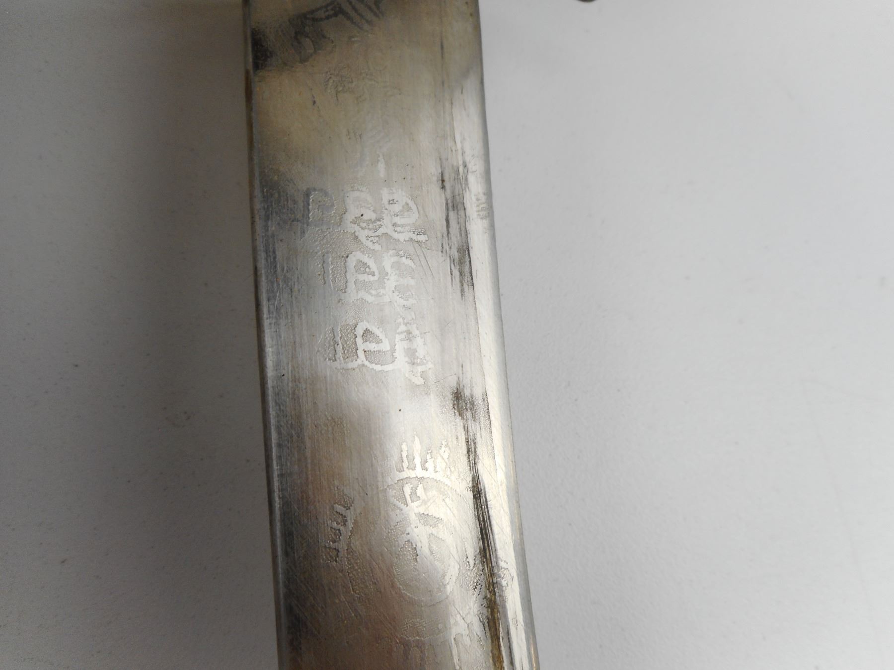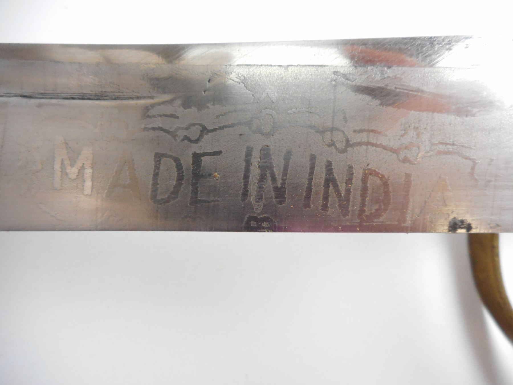 MADE IN INDIA SWORD WITH SCABBARD , DECORATIVE BLADE, MARKED MADE IN INDIA. BLADE LENGTH APPROX. 29.5" TOTAL LENGTH APPROX. 35".