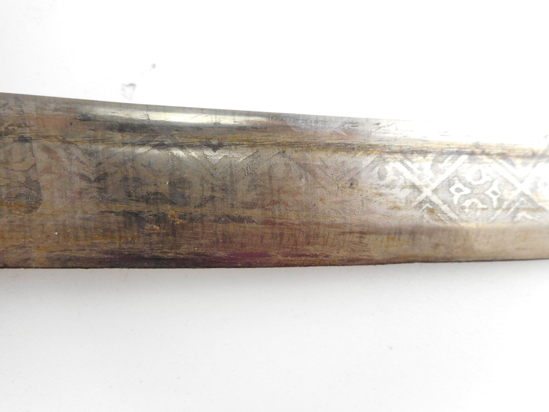 MADE IN INDIA SWORD WITH SCABBARD , DECORATIVE BLADE, MARKED MADE IN INDIA. BLADE LENGTH APPROX. 29.5" TOTAL LENGTH APPROX. 35".