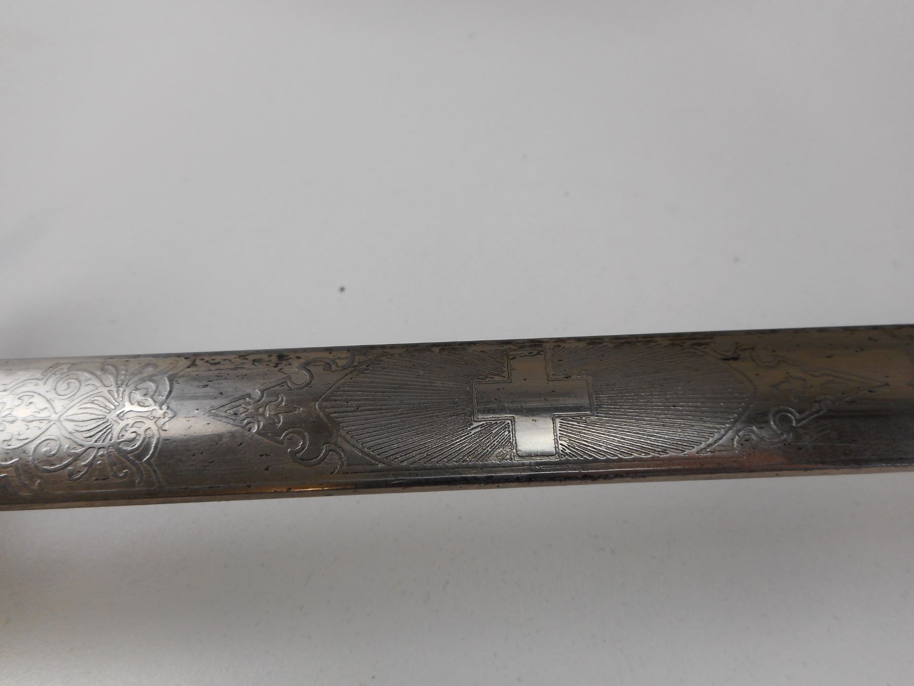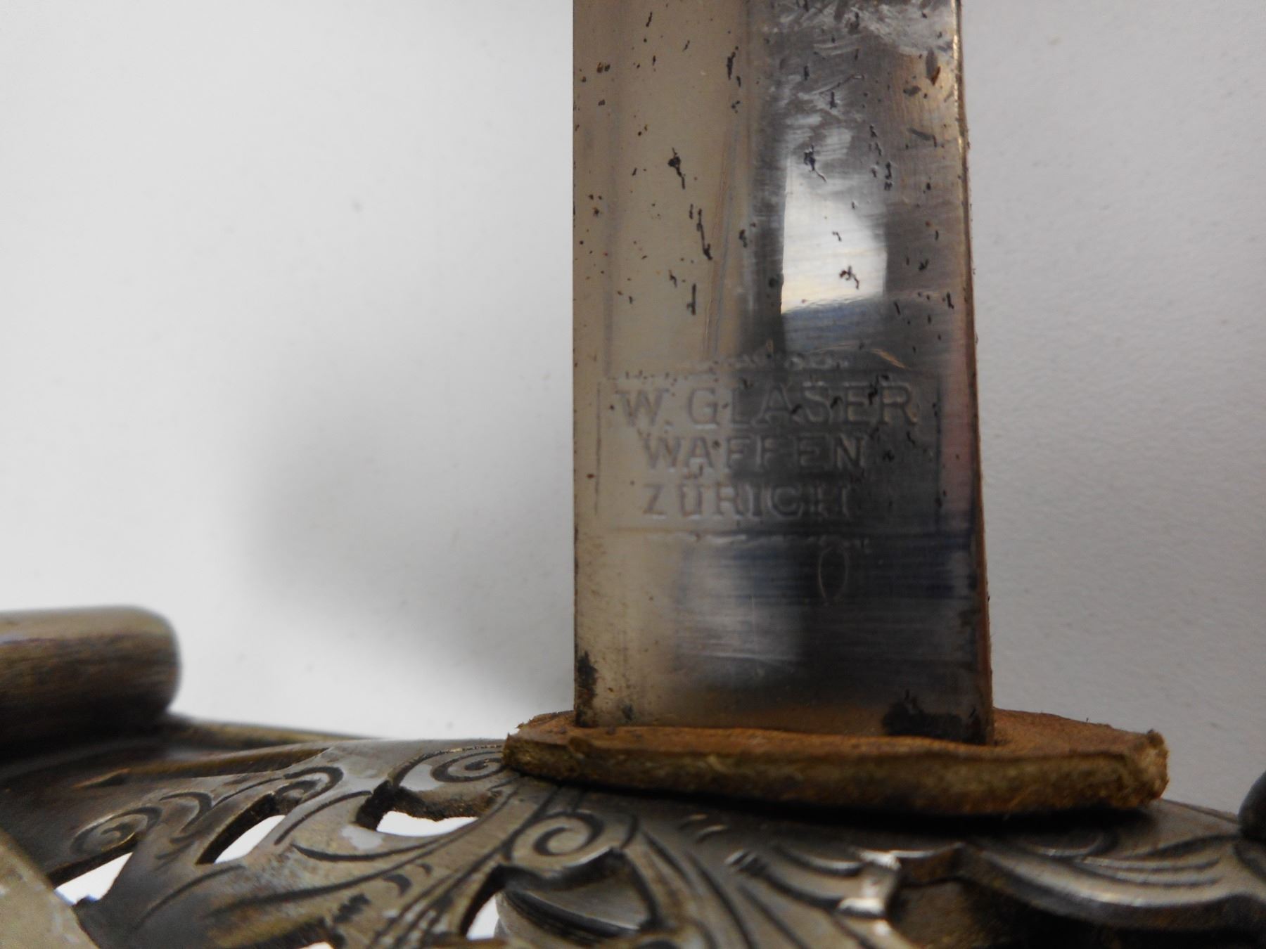 SWISS 1867-1889 OFFICERS SWORD AND SCABBARD , RICASSO MARKED W.GLASSER WAFFEN ZURICH. BLADE HAS DECORATIVE ETCHING. BLADE LENGTH APPROX. 33.75" TOTAL APPROX. LENGTH 39.5". HAS STEEL SCABBARD