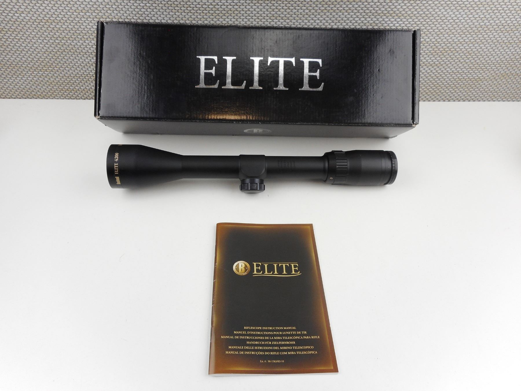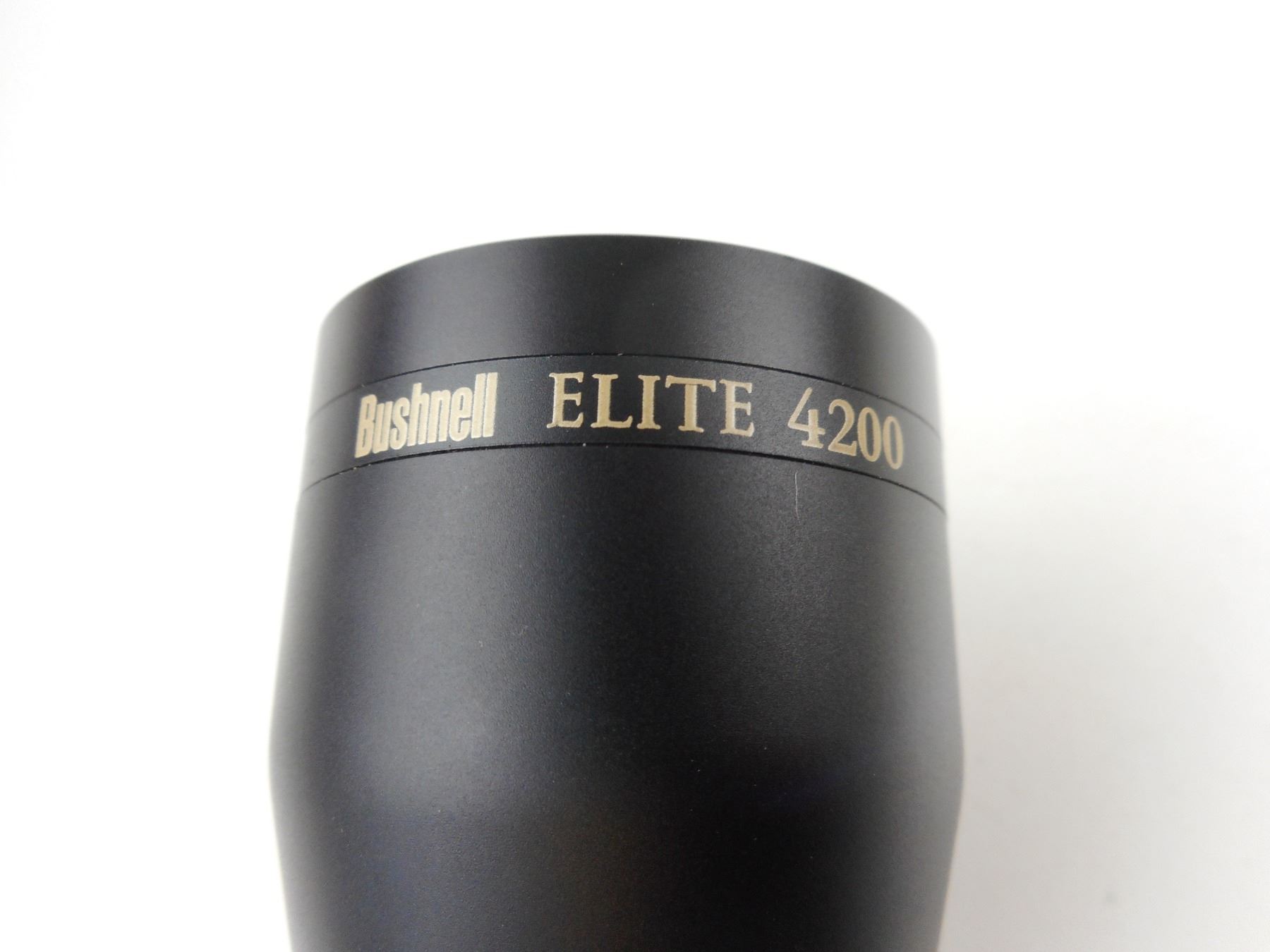 BUSHNELL ELITE 3-9X40 SCOPE WITH BOX , CLEAR VISIBILITY WITH DUPLEX CROSSHAIR RETICLES, MARKED BUSHNELL ELITE 4200. COMES WITH ORIGINAL BOX AND INSTRUCTION MANUAL