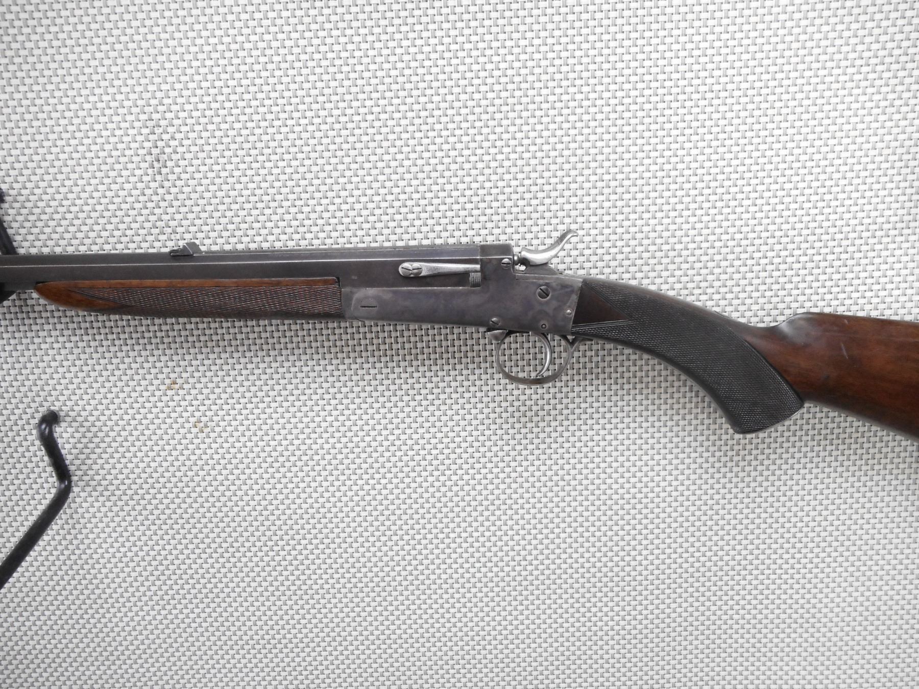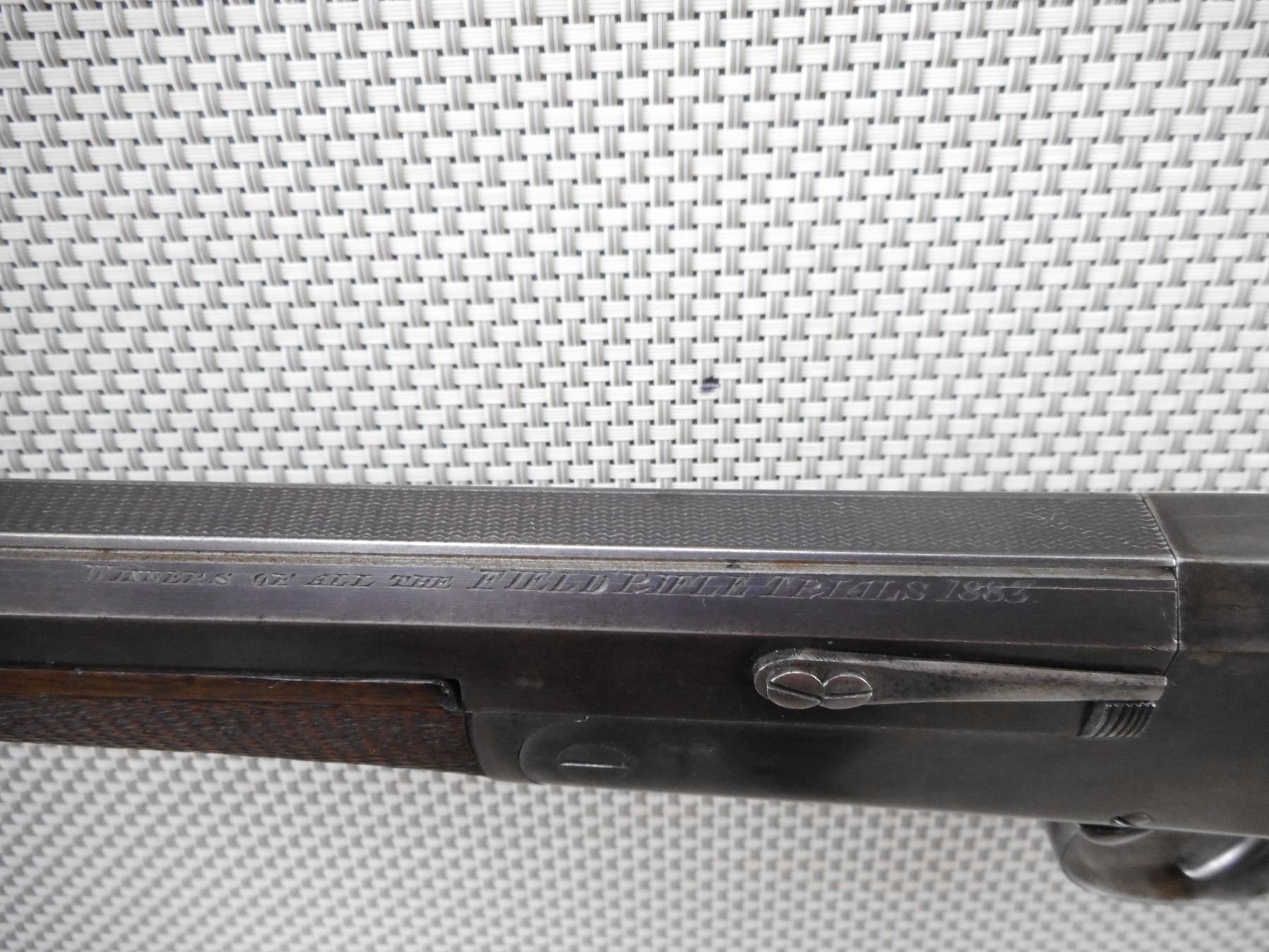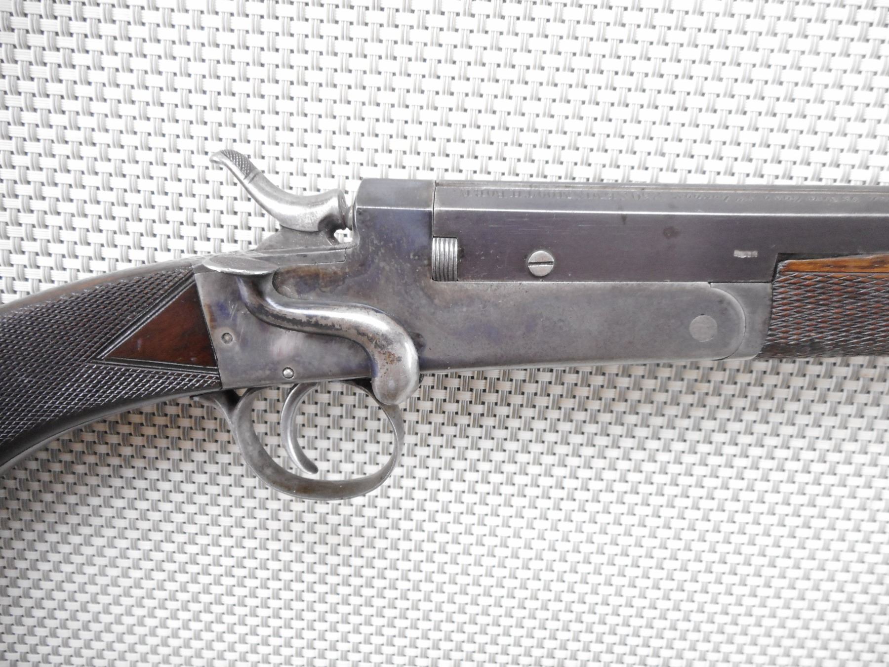HOLLAND & HOLLAND, MODEL:ROOK RIFLE, CALIBER 250 ROOK, MANUFACTURED IN 1887 ( USA ANTIQUE) BORE IS VERY GOOD. HAS BLADE FRONT SIGHT. U NOTCH REAR SIGHT WITH TWO FOLDING LEAFS. 100, 150 YARD SIGHTS. OCTAGONAL BARREL. SERRATED RIB ON TOP OF BARREL. CHECKERED WOOD FOREND. CHECKERED BUTT STOCK WITH STEEL GRIP CAP, STEEL BUTT PLATE. BARREL IS BLUED. RECEIVER IS COLOUR CASE HARDENED. LEFT SIDE OF BARREL IS MARKED WINNERS OF ALL THE FIELD RIFLE TRIALS 1883. RIGHT SIGHT OF BARREL IS MARKED HOLLAND & HOLLAND 98 NEW BOND ST LONDON 250. SEMI SMOOTH BORE. EXTERNAL HAMMER. RIGHT SIDE OPENING LEVER. EJECTOR. SHOWS SOME WEAR TO THE BLUEING. SOME RUB MARKS AND SMALL DINGS IN THE WOOD., SERIAL # 10900, BARREL LENGTH, 24 1/2", CONDITION: 7/10, CLASS: CANADIAN NON RESTRICTED CLASS