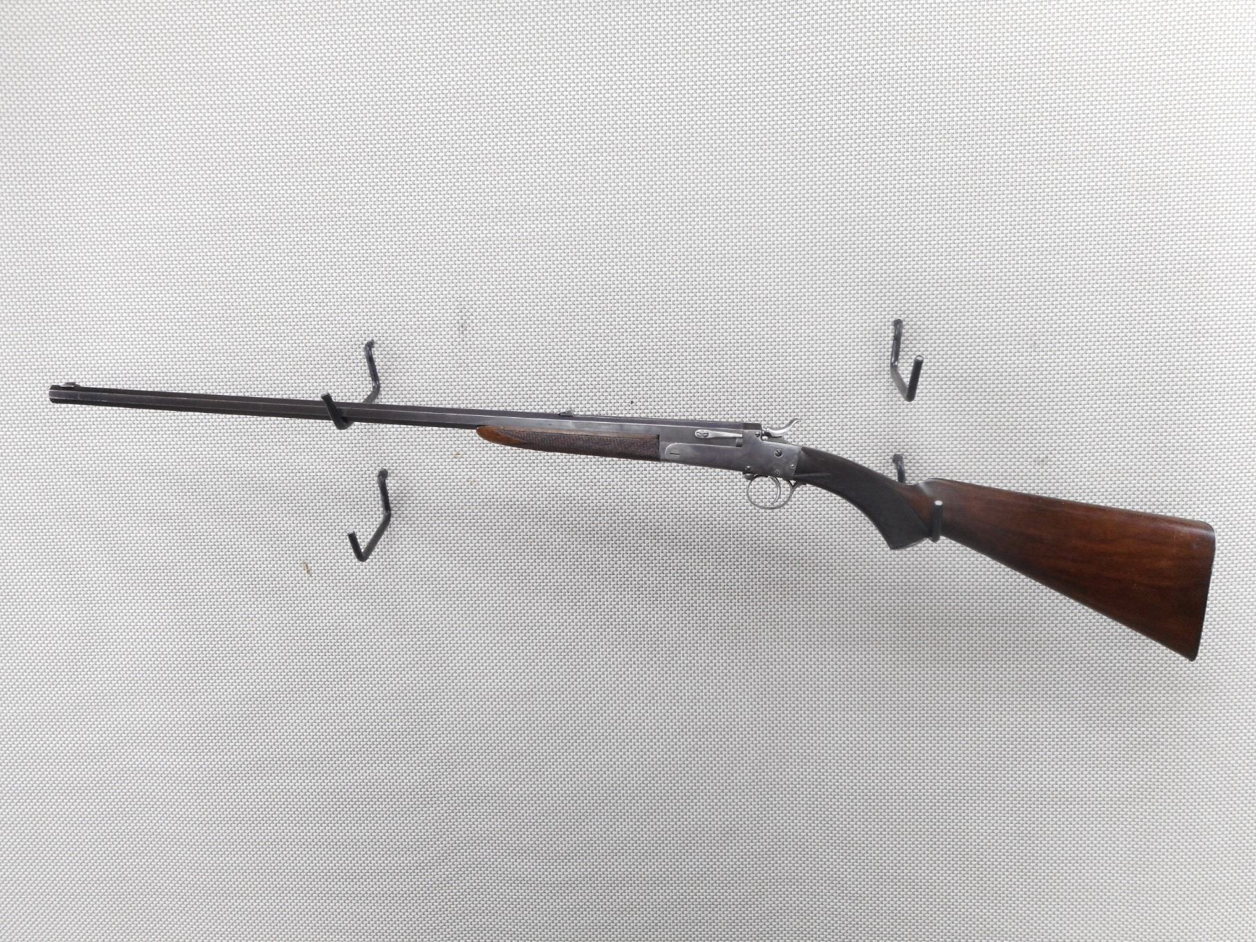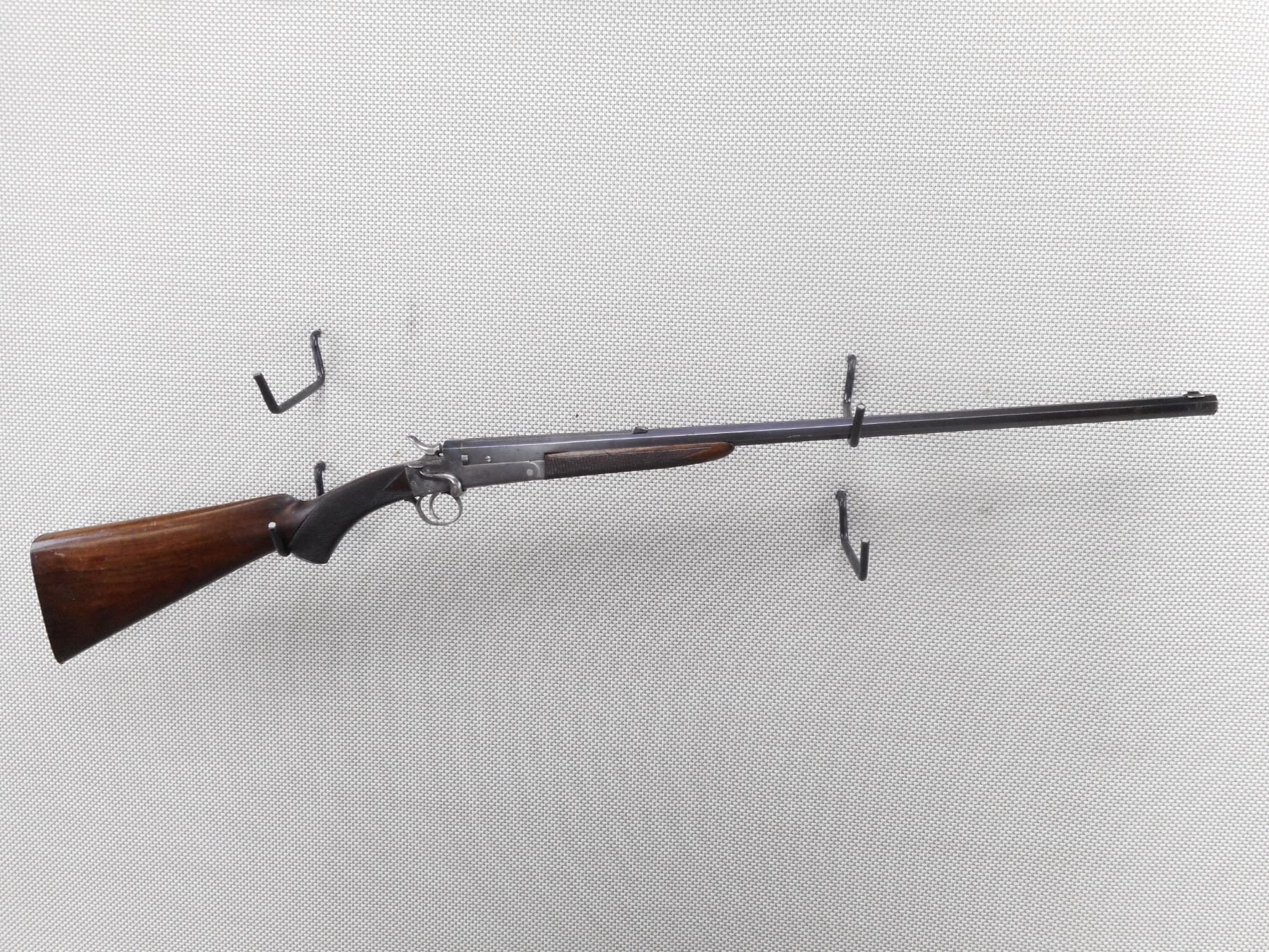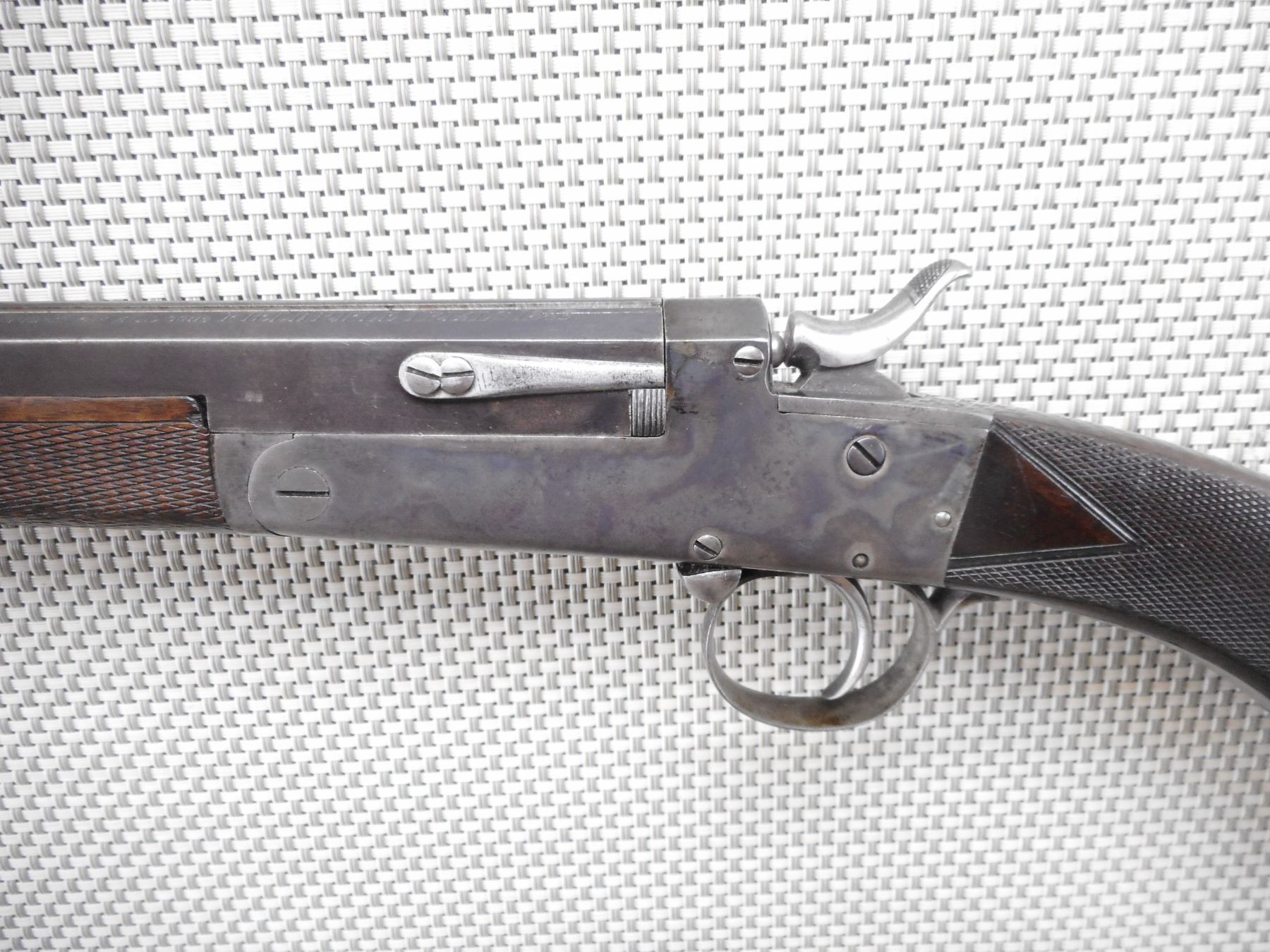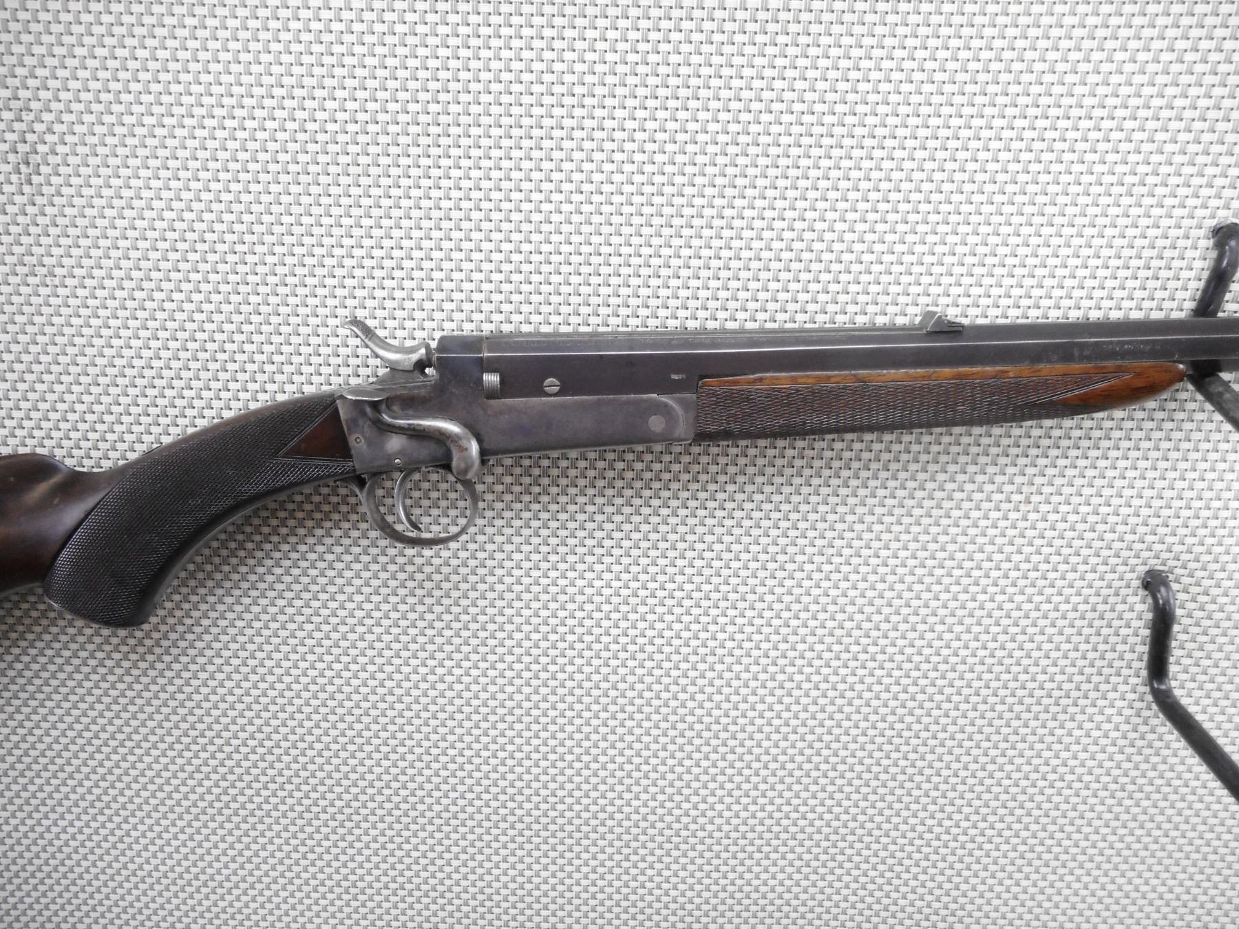 HOLLAND & HOLLAND, MODEL:ROOK RIFLE, CALIBER 250 ROOK, MANUFACTURED IN 1887 ( USA ANTIQUE) BORE IS VERY GOOD. HAS BLADE FRONT SIGHT. U NOTCH REAR SIGHT WITH TWO FOLDING LEAFS. 100, 150 YARD SIGHTS. OCTAGONAL BARREL. SERRATED RIB ON TOP OF BARREL. CHECKERED WOOD FOREND. CHECKERED BUTT STOCK WITH STEEL GRIP CAP, STEEL BUTT PLATE. BARREL IS BLUED. RECEIVER IS COLOUR CASE HARDENED. LEFT SIDE OF BARREL IS MARKED WINNERS OF ALL THE FIELD RIFLE TRIALS 1883. RIGHT SIGHT OF BARREL IS MARKED HOLLAND & HOLLAND 98 NEW BOND ST LONDON 250. SEMI SMOOTH BORE. EXTERNAL HAMMER. RIGHT SIDE OPENING LEVER. EJECTOR. SHOWS SOME WEAR TO THE BLUEING. SOME RUB MARKS AND SMALL DINGS IN THE WOOD., SERIAL # 10900, BARREL LENGTH, 24 1/2", CONDITION: 7/10, CLASS: CANADIAN NON RESTRICTED CLASS