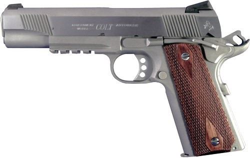 Stainless Steel Frame, Rosewood Grips, 5" National Match Brl, Novak Low Mount Sights, Enhanced hammer, upswept beaver tail, grip safety, 38.5 oz, M1913 Pic. Rail, FFL Cost $1021 01072RG