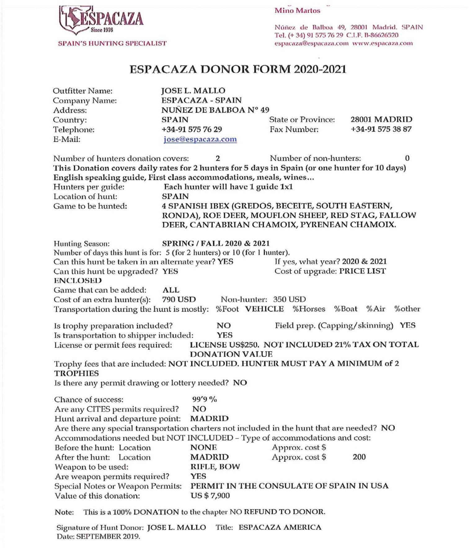 Espacaza - Spain has donated a 5 day hunt for 2 hunters in Spain. Value $7,900. Click on image for additional information