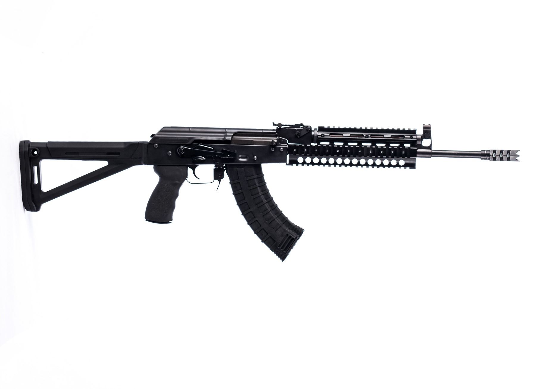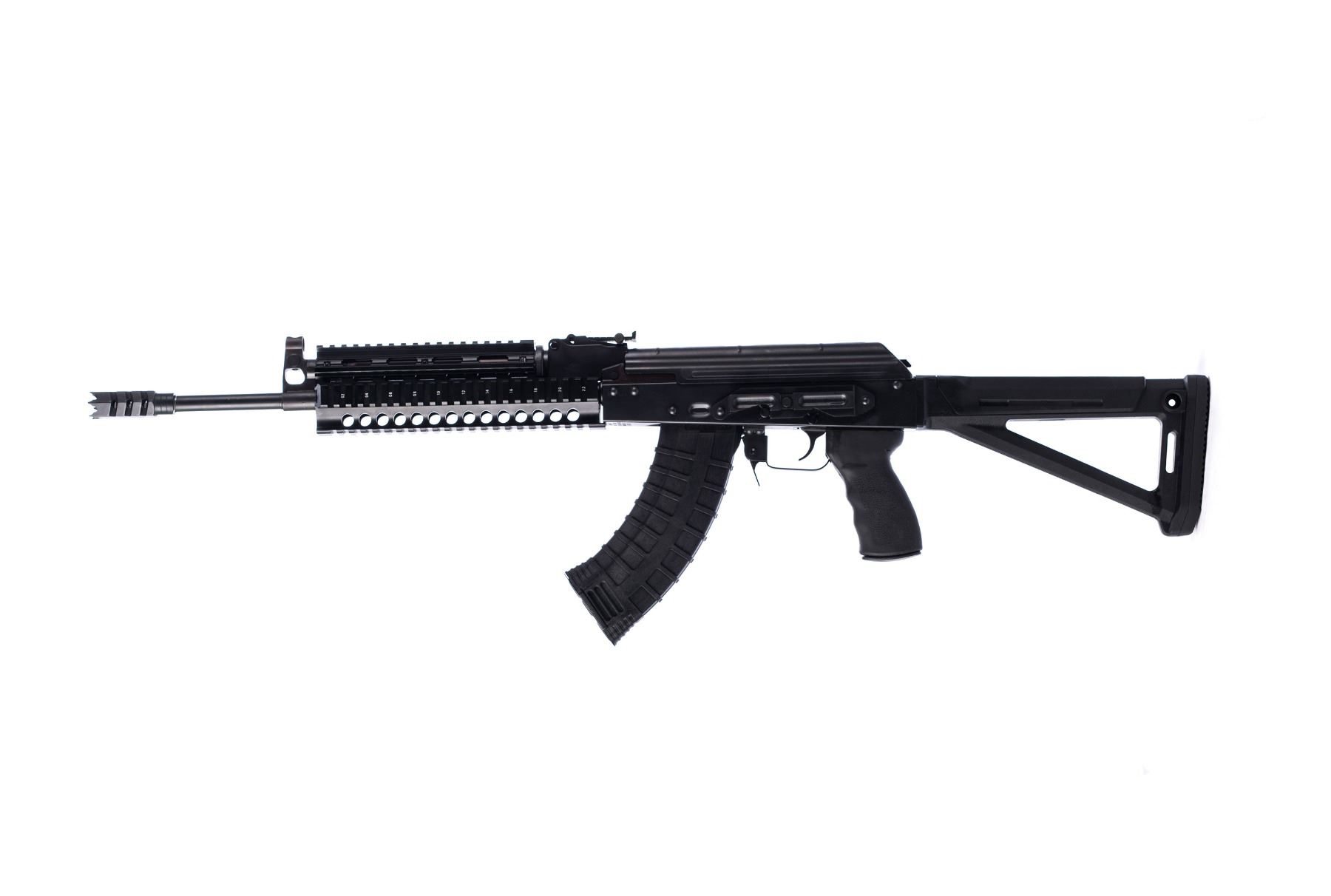 The Riley Defense RAK-47-T-MP Rifle (Tactical-Magpul) in 7.62x39mm. This is the Riley Defense tactical version of the American made classical Ak-47 rifle (7.62x39mm) with a tactical twist and measures 36.5” in overall length. Features include: Semi-automatic closed-bolt action; Fully Heat treated stamped Receiver; 4150 Nitride Barrel (16.25” length); Forged Trunion; Black tactical polymer butt stock (Magpul) and tactical pistol grip, black aluminum quad rail and muzzle brake; Black Oxide Finish; Front and rear sight (both adjustable); Caliber: 7.62 x 39 mm; Magazine Capacity: 30; Range: 350 yds (effective), 1000 yds (Max); Machined scope mount rail; Bolt hold open; Extend magazine release. Made in the USA!