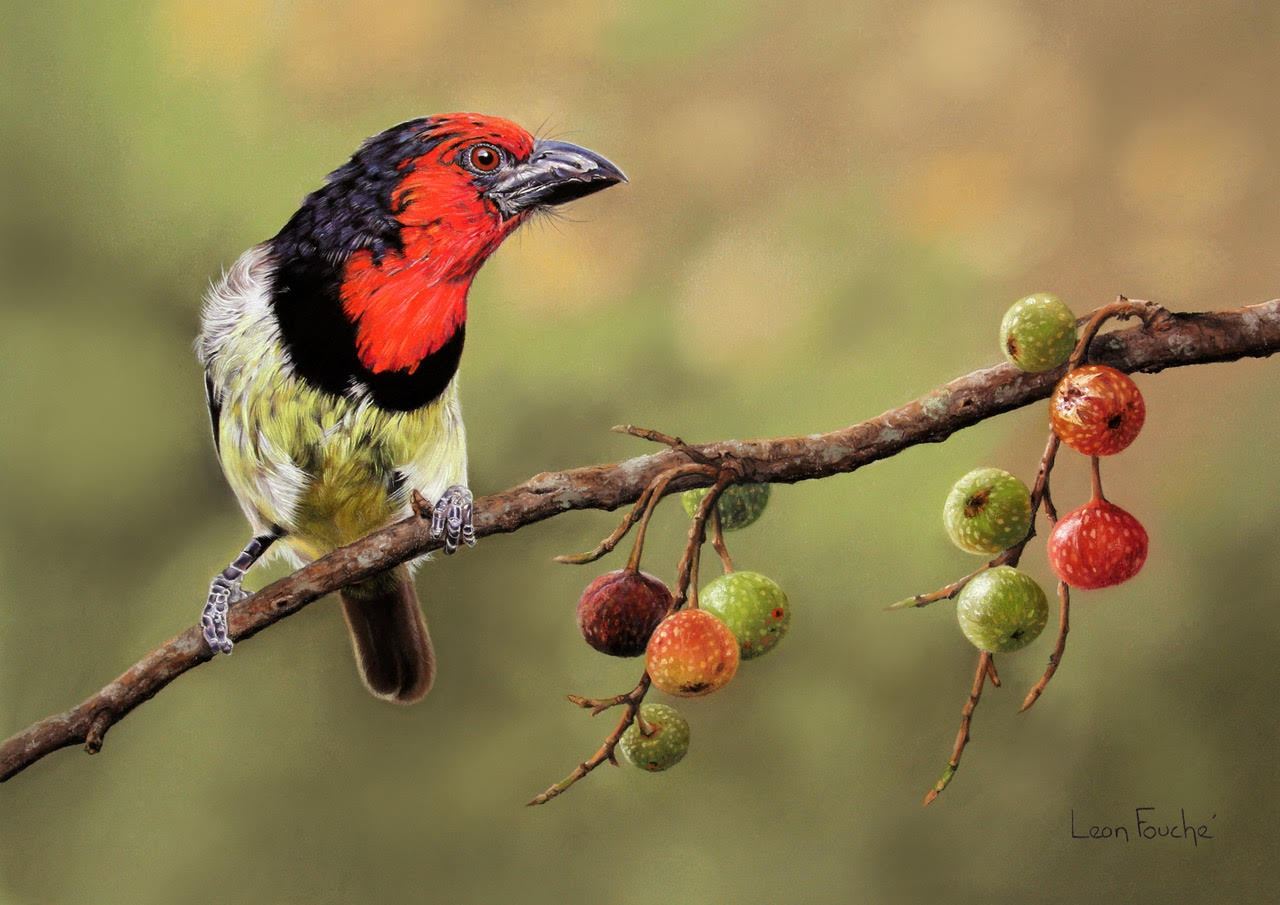 Artist Leon Fouche has donated "Black-Collared Barbet", a 18" x 12" original soft pastel. This barbet is one of southern Africa's most colorful birds. They can often be seen feeding on the brightly colored fruit of Africa's fig trees. Their character is very bold and cheeky which makes them a pleasure to watch, they also have a beautiful song which the pair performs in duet. HSCF thanks Leon Fouche for this donation. fouchestudios.com.