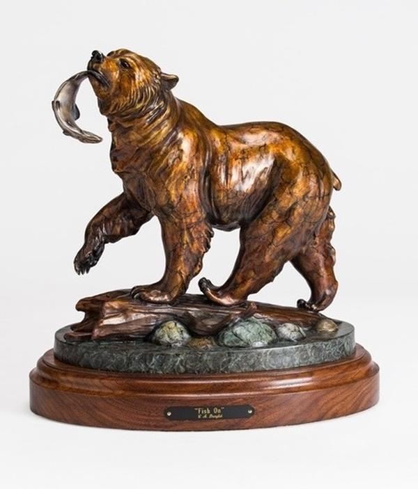Rick Taylor - Sculptor has donated a Bronze Sculpture of a Grizzly Bear titled 'Fish On' #20 of 48 by Carole Danyluk. The bronze bear has successfully caught a salmon and stands 12-in. tall by 12-in. weighing 25-lbs. the sculpture displays a fabulous enhanced patina. Twelve inches tall, it is mounted on beautiful African zebra wood. Married to Rick Taylor, Carole Danyluk is a renowned wildlife artists on the contemporary sculpture scene; Her art is appreciated and collected by museums and indviduals worldwide. For more information, contact Mr. Rick Taylor at 250-353-7735 and www.ricktaylor.com.