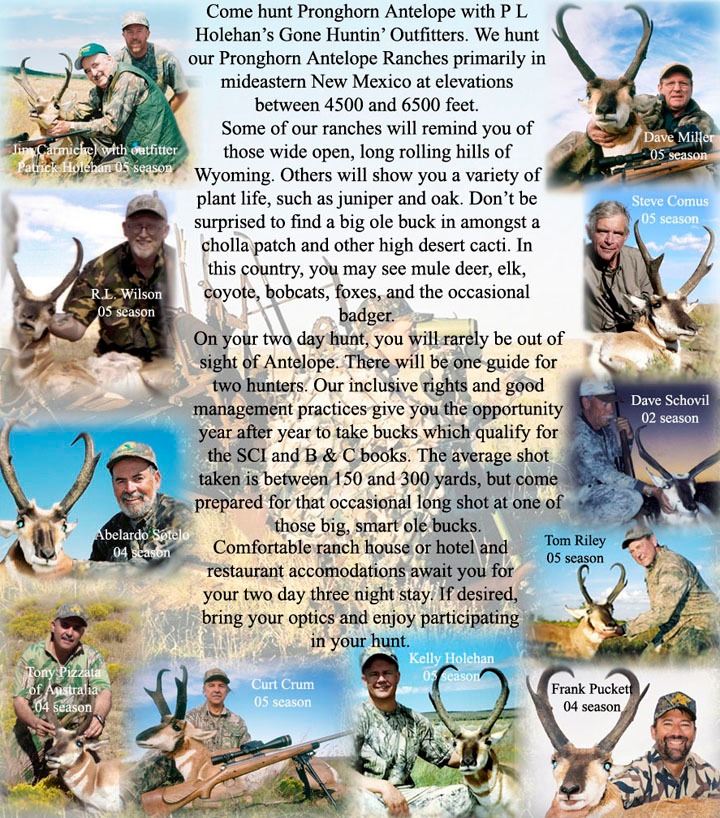 One hunter will travel to New Mexico for this 3-day. 2x1 guided pronghorn antelope hunt donated by P L Holehan Custom Rifles and Gone Hunting Outfitters. Method of take is hunter's choice. Schedule hunt with outfitter for open dates October 2020 only. No alternate dates are available. Hunt will take place in mid-eastern New Mexico at elevations between 4,500-6,500 feet with wide open, long rolling hills and a variety of plant life such as juniper and oak. Included are guide service, trophy fee for pronghorn and field prep. Additional hunters and non-hunters are welcome; see outfitter for details. Not included are accommodations, license/tag ($375), dip/pack/ship and gratuities. Arrival/departure point is Roswell, New Mexico. For more information, contact Patrick Holehan at 520-745-0622. Company's website: www.plholehancustomrifles.com