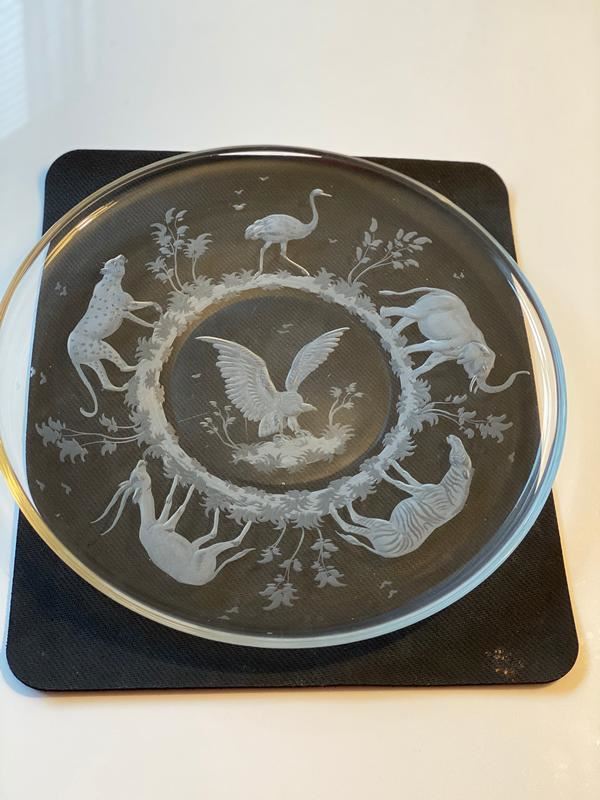 Hand-made and hand-engraved by master craftsmen of Queen Lace Crystal Handcrafted Queen Lace Crystal Plate has been donated by Queen Lace Crystal-Joan Marie Galleries. The one-of-a-kind plate has 6 hand engraved wildlife designs. Queen Lace Crystal is a family business of over 50 years specializing in exotic accents for the home, bar and office. For more information on our collections and custom work, please visit our website at www.queenlacecrystal.com or call 800-985-7575.