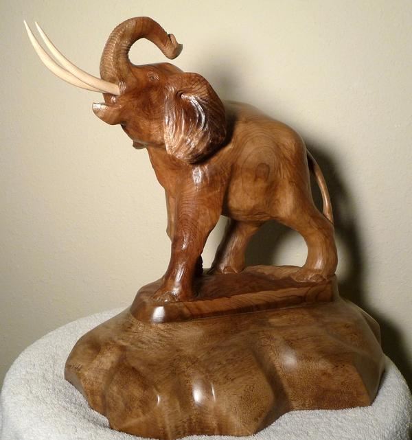 Complement your trophy room, den or office with the Original Wood Sculpture 'The Trumpeter' by artist Terry Woodall donated by Gary Johnson Studio. The Presidential Elephant hand carved from Oregon myrtlewood based on a prototype also carved in myrtlewood by Terry's mentor, carver Bob Harbison (deceased, 1960's) that graced the desks of Richard Nixon, Ronald Reagan, Oregon Senator Mark Hatfield and others. Myrtlewood is one of the beautiful exotic hardwoods of the world. Measures 15-in. H by 14-in. W by 10-in. D. For more information, contact Terry Woodall at 541-404-3505 at 760-942-7373 and visit www.terrywoodall.com.