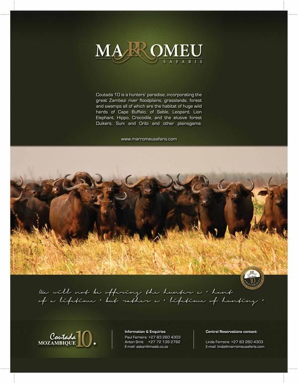 Marromeu Safaris invites one hunter and one observer for a 10-day, 1x1 guided Cape buffalo hunt. Method of take is rifle or bow. Schedule hunt with outfitter for available dates July-November, excluding August of 2020, only. No alternative dates are available. Marromeu Safaris is situated adjacent to the south western border of the Marromeu National Park and operates the renowned hunting area Coutada 10. This prime hunting spot covers an area in excess of 1,000 square miles, unfenced and near the Indian Ocean coastline. Coutada 10 is a hunter's paradise, incorporating the great Zambezi river floodplains, grasslands, forests and swamps, all of which are the habitat of huge wild herds of Cape buffalo, sable, leopard, lion, elephant, hippo, crocodile, and the elusive forest duikers, suni and oribi and other plains game. Included are en-suite chalet accommodations, meals, 1x1 guide service, trophy fee for one Cape buffalo, firearm permit, hunting permit, VAT and field prep. Additional hunters and non-hunters are welcome; see outfitter for details. Not included are before/after hunt expenses, air transfers (approx. $3,500), dipping/packing/shipping of trophies ($25 per trophy) and gratuities. Arrival/departure point is Beira, Mozambique. For more information, contact Paul Ferreria by email at linda@marromeusafaris.com or by phone at Int. 27 83 260 4303. Company's website: www.marromeusafaris.com