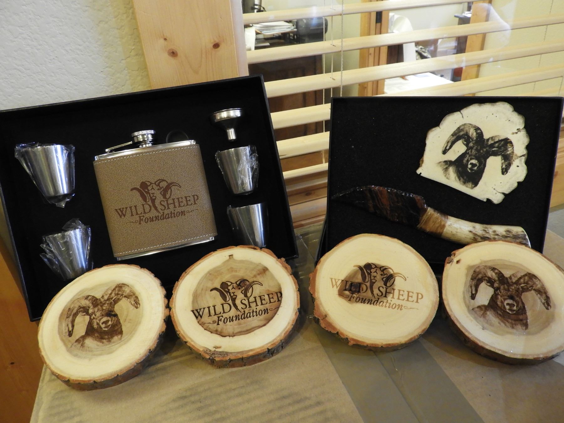 Lot 29 Custom WSF Knife with a Flask and Log Coaster Gift Set