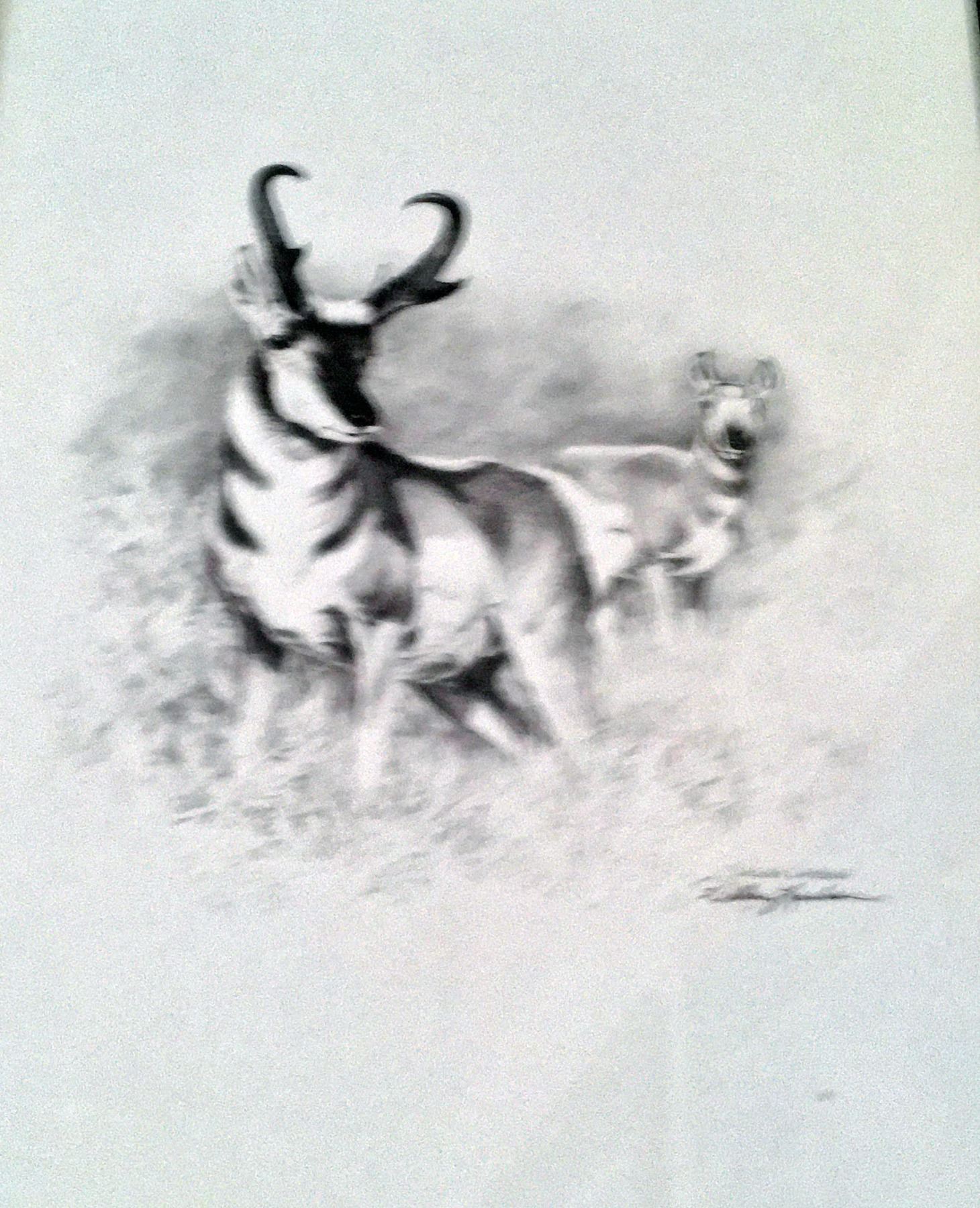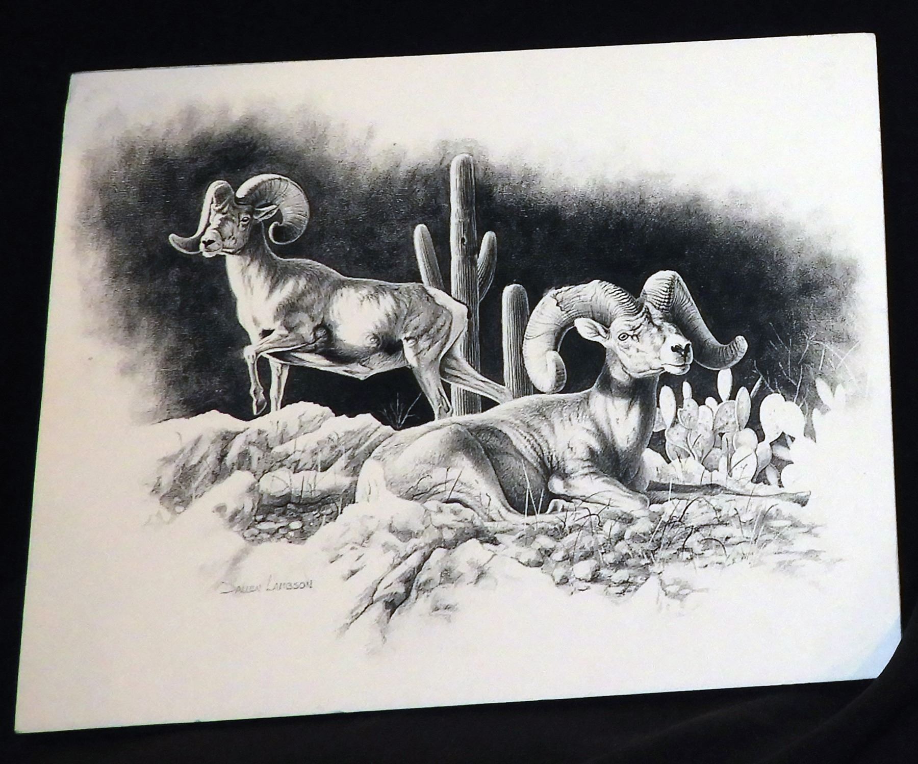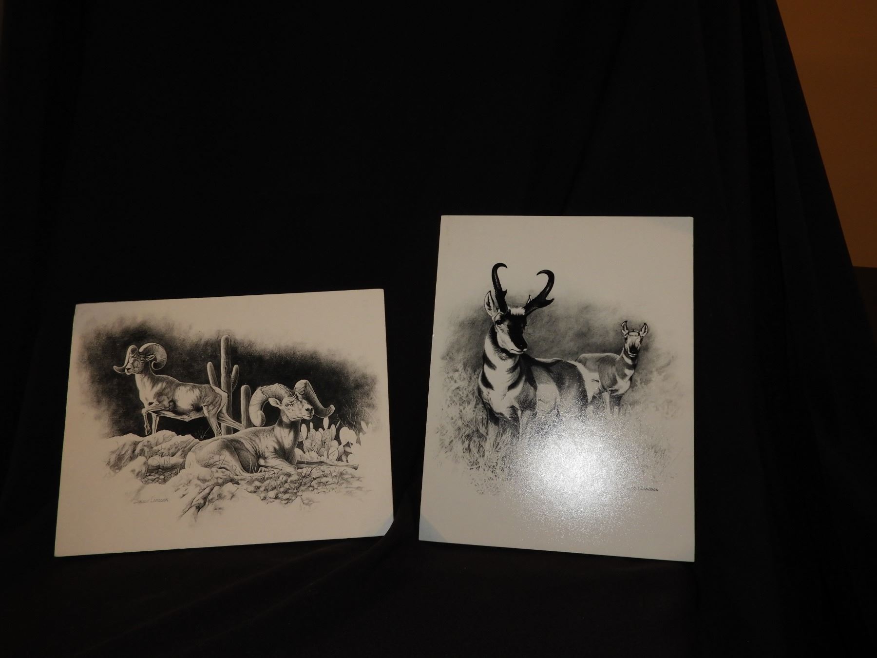 Description: Three small prints by renowned artist, Dallen Lambson: Antelope, Desert Sheep and Cabin on the Creek