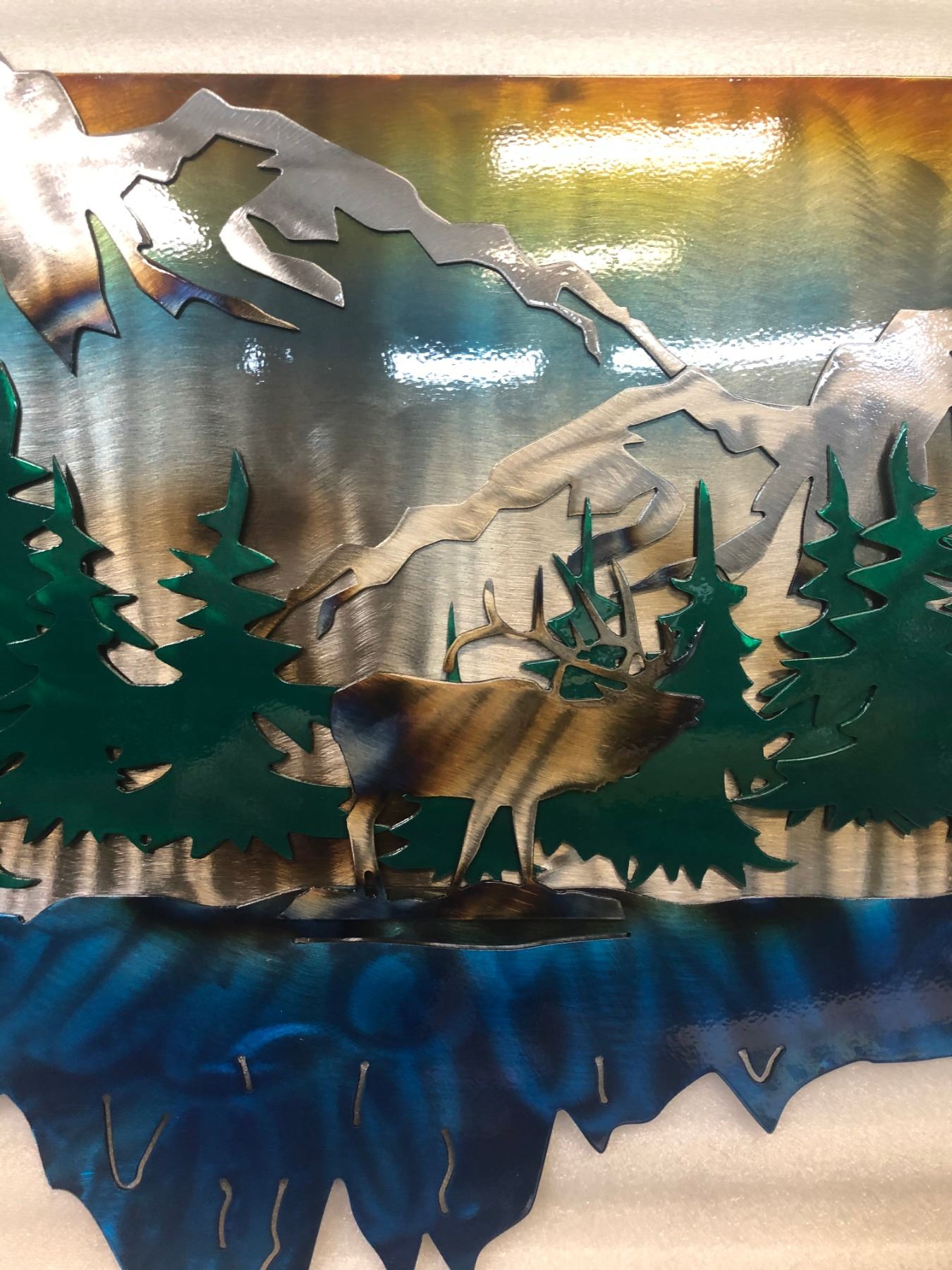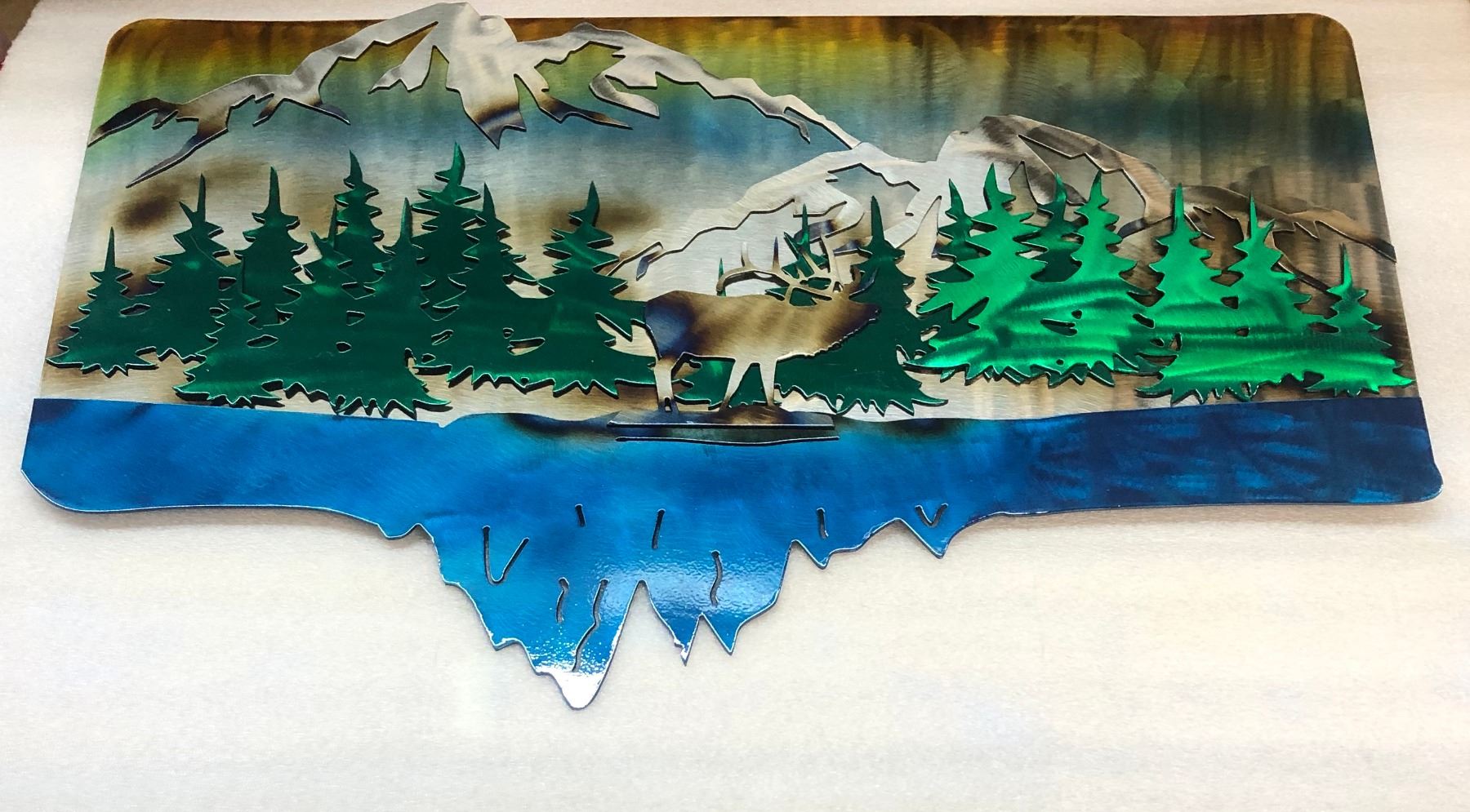 ** Exhibitor** This one of a kind Metal Art Work is plasma cut from USA steel, hand ground, torch blued, painted with translucent paint, and powder coated with clear finish. The Bugling Elk is comprised of three layers of 16ga steel. The size is 29 1/2" x 19 1/4"