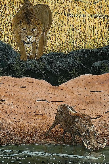 DONATION: “Lion in Wait” includes black floating frame, 23 Karat gold leaf name plaque and certificate of authenticity. Name plaque engraved with Daniel Earl Devine - Wild Encounters Collection. Limited edition, signed and numbered. Dan’s paintings show wildlife encounters in their natural habitat. The paintings are action oriented and the viewer is in anticipation of a climactic moment unfolding. Creating true to life drama. He paints using similar techniques as the old masters. Laying down layers of dark background. Then layering on light and color. Finishing with a flat or gloss varnish. He paints with Windsor and Newton Sceptre Gold II [0000] brushes, or Windsor Newton University Series [000] for the most part. Which are the smallest brushes on the spectrum. While standing, he paints using a magnification lamp in order to capture the desired detail. The paintings are done in oils. On double primed extra fine Caravaggio linen canvas. It takes him approximately three months to complete a 20” x 30” painting. It is a very labor intensive process.