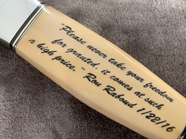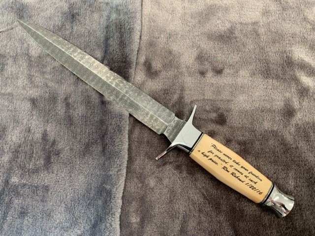 Description: Custom Dagger by Friedly - We at Heritage Collectables are proud to present this one-of-a-kind piece of artwork by renowned knife maker Dennis Friedly from Cody, WY. I commissioned Dennis to build this edition with Devin Thomas Damascus. He started by handcrafting the Damascus billet into the shape of a dagger blade. After hand grinding, the blade is fitted with a nickel silver guard, pre-ban ivory handle and nickel silver guard. Upon completion of a very classy and valuable addition for my collection, the dagger was featured in one of my showcases. The future of my dagger changed after I attended the Jan. 22, 2016 Wild Sheep Foundation banquet and heard a speech by Ron Raboud. His speech, especially the ending, “Please never take your freedom for granted, it comes at such a high price,” really inspired me. After giving it more thought, I decided that that quote needed to be scrimshawed on the dagger handle. I contacted scrimshaw artist Sandy Brady and asked her if she would scrim the quote on the ivory handle. Sandy readily agreed, so I present “THE RABOUD DAGGER BY FRIEDLY”
