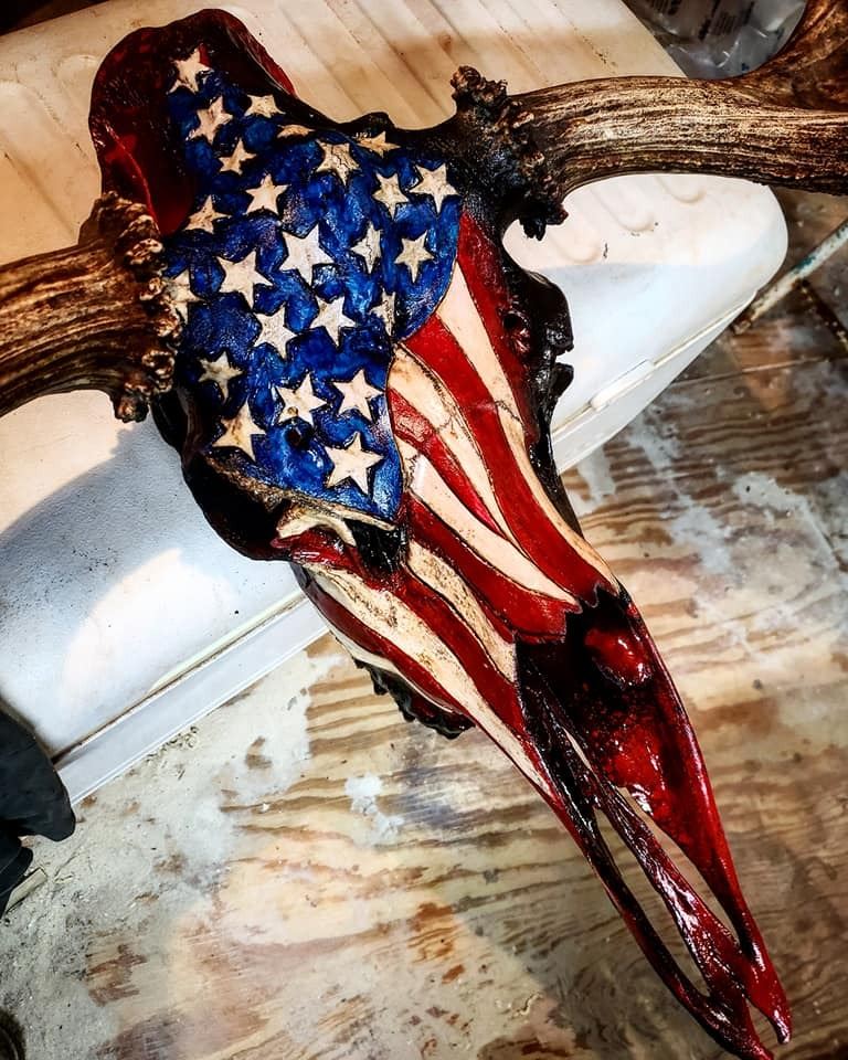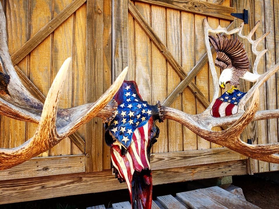 DONATION: Well Nevada Grassie has brought us another amazing piece! “The Four Fathers” is a 65” Bull moose skull with a FNAWS of sheep in deep relief engraving in the moose paddles. The skull will be engraved and with a color flag with engraved Patriotic images. The skull is donated by Ralph and Vicki. The base will be done by Rick Popovich. Work is in progress so look for this amazing piece in the Live Auction Display at the 2020 “Sheep Show”! Proceeds from “The Four Fathers” will go directly to WWO to further their mission, “Providing wounded serviceman and women with therapeutic outdoor adventures across North America”.