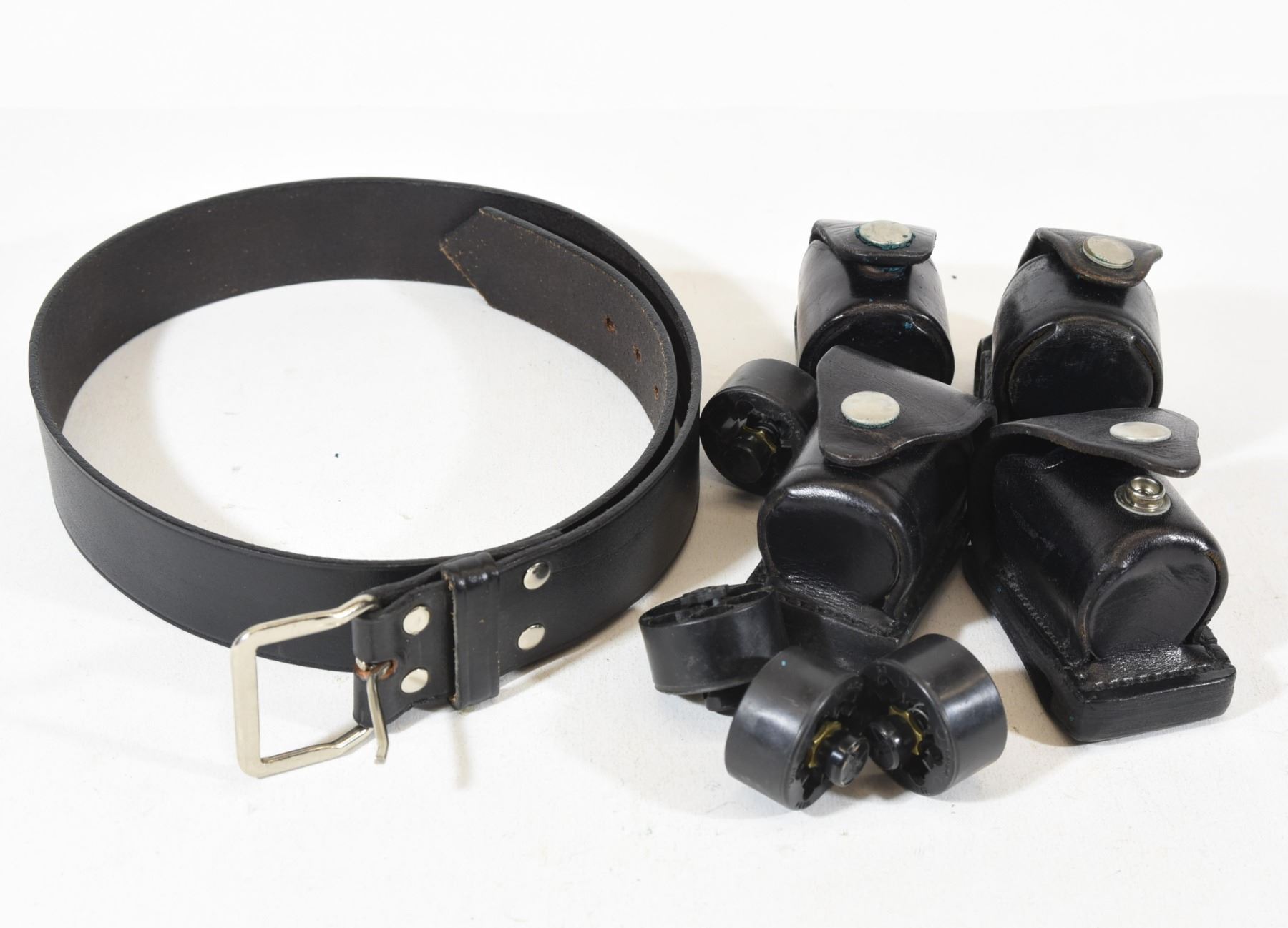 Four leather speed loaders with holsters and size 30 belt.