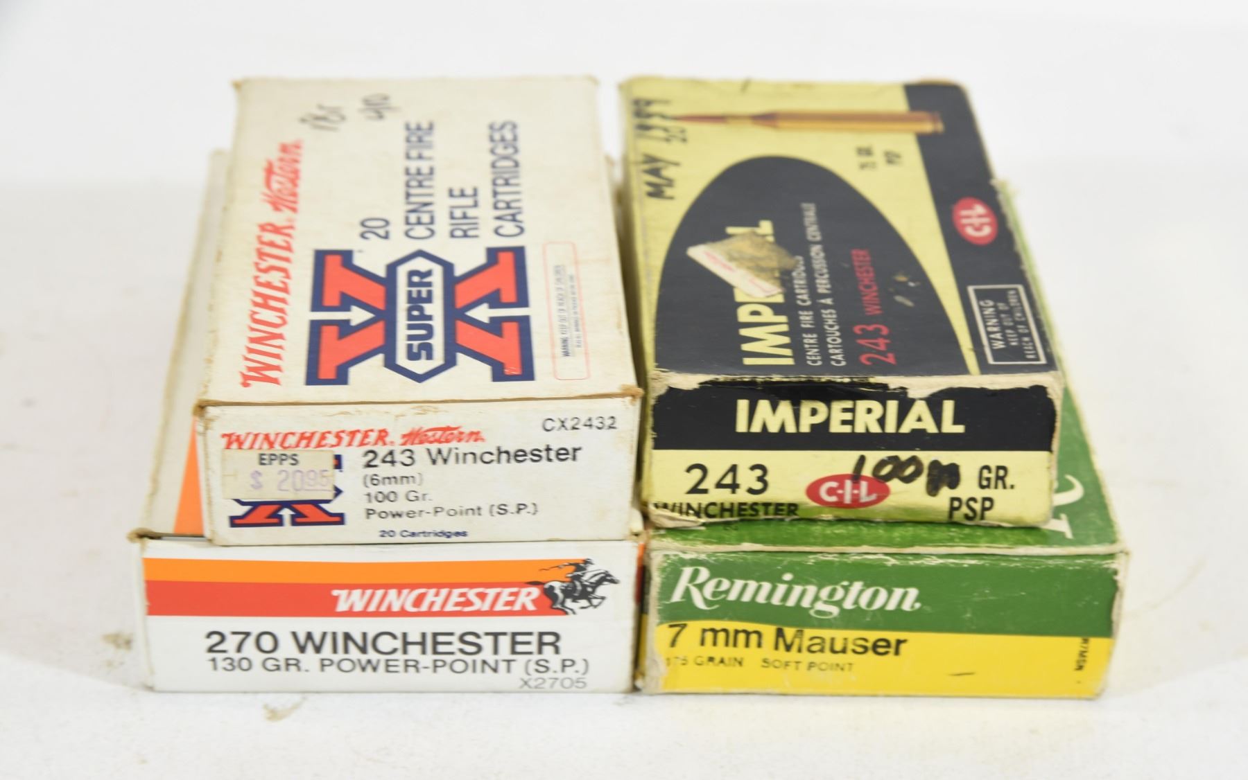 1) 18 rounds of .410 imperial #7 1/2 shot shells in Winchester box 2) 20 rounds of 243 Winchester 75grain 3) 20 rounds of 270 Winchester 130grain 4) 14 rounds of 7mm Mauser unknown weights