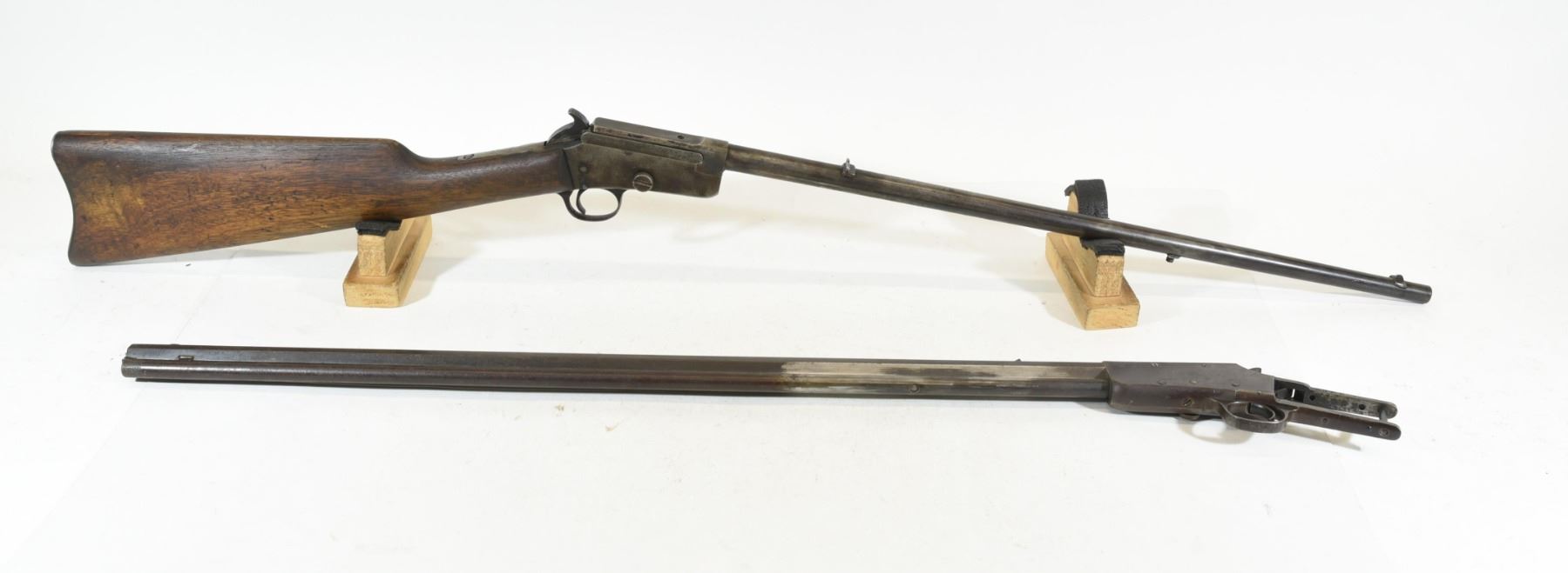 Non restricted 1) Marlin model 29, pump action, .22 cal. 20" barrel, wooden butt stock has just a few light scratches & dents, bluing is brown, bore is fair to good, missing the mag tube and the pump action part of the gun 2) Marlin model 20-A, parts gun, no wood, bluing is brown, bore is poor