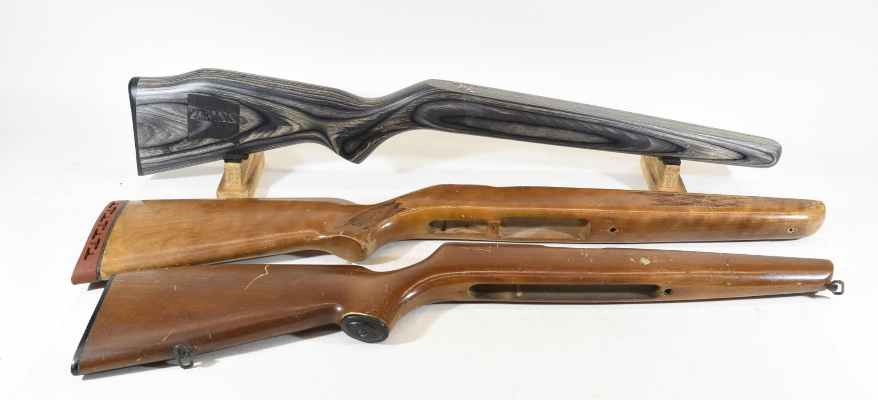 1) Stevens Springfield 12 ga. bolt action stock, has light scratches and marks 2) Stevens .22 stock, has light scratches and marks 3) Laminated blank rifle stock