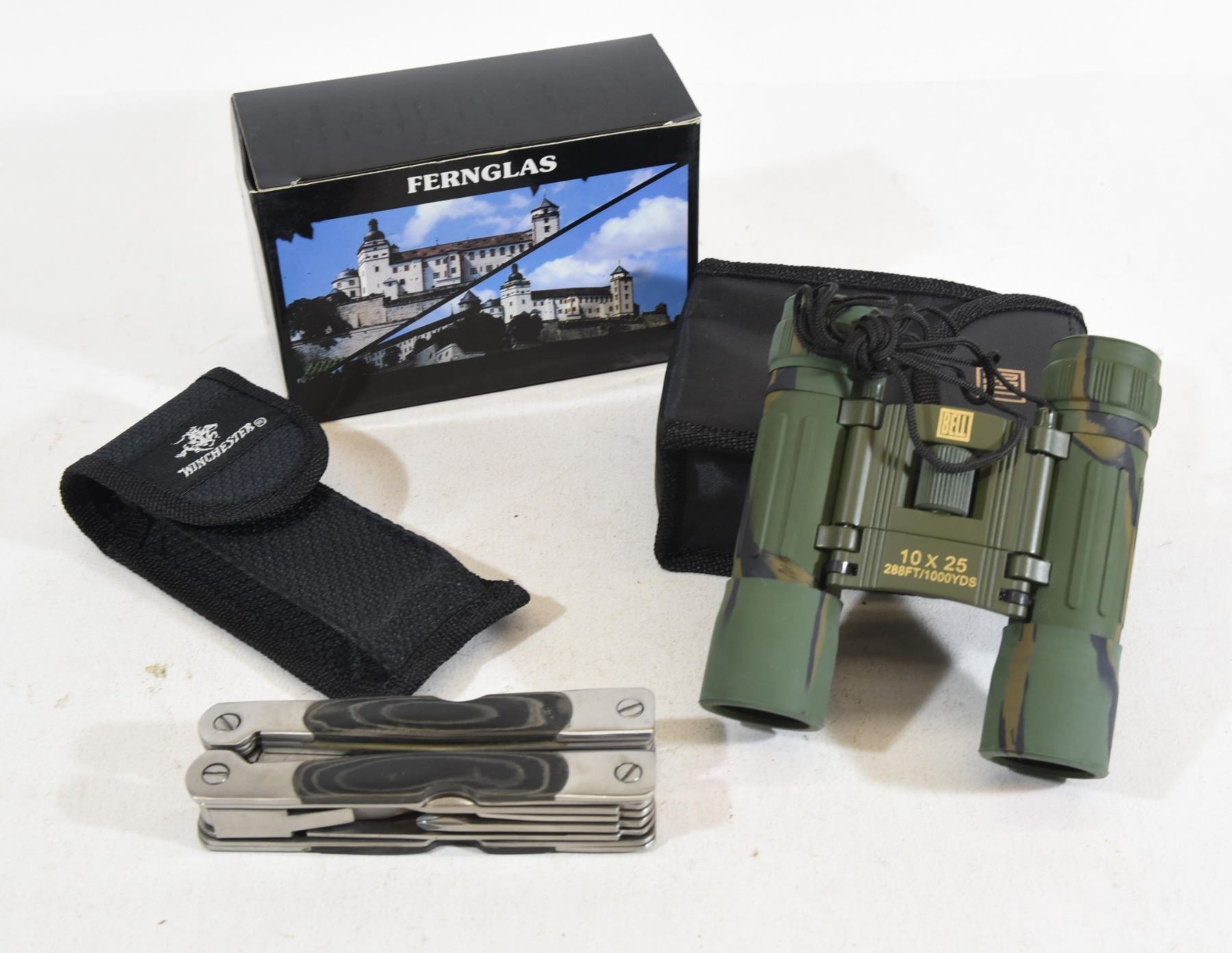 1) Bell 10 x 25 binoculars as new 2) Winchester multi-tool as new