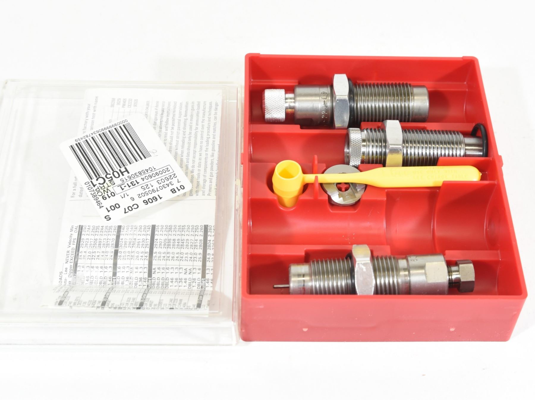 3 piece set of Lee .223 dies with shell holder and powder measurer as new.