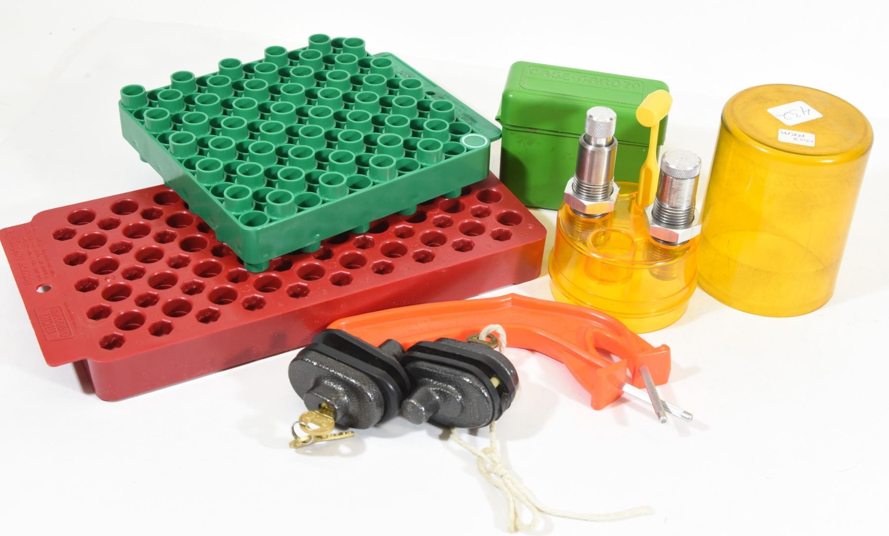 1) 2 bullet trays and a Case-Gard 20 bullet holder 2) Edgemaker knife sharpener 3) 2-piece set of .223 dies and powder measurer 4) 2 trigger locks with keys