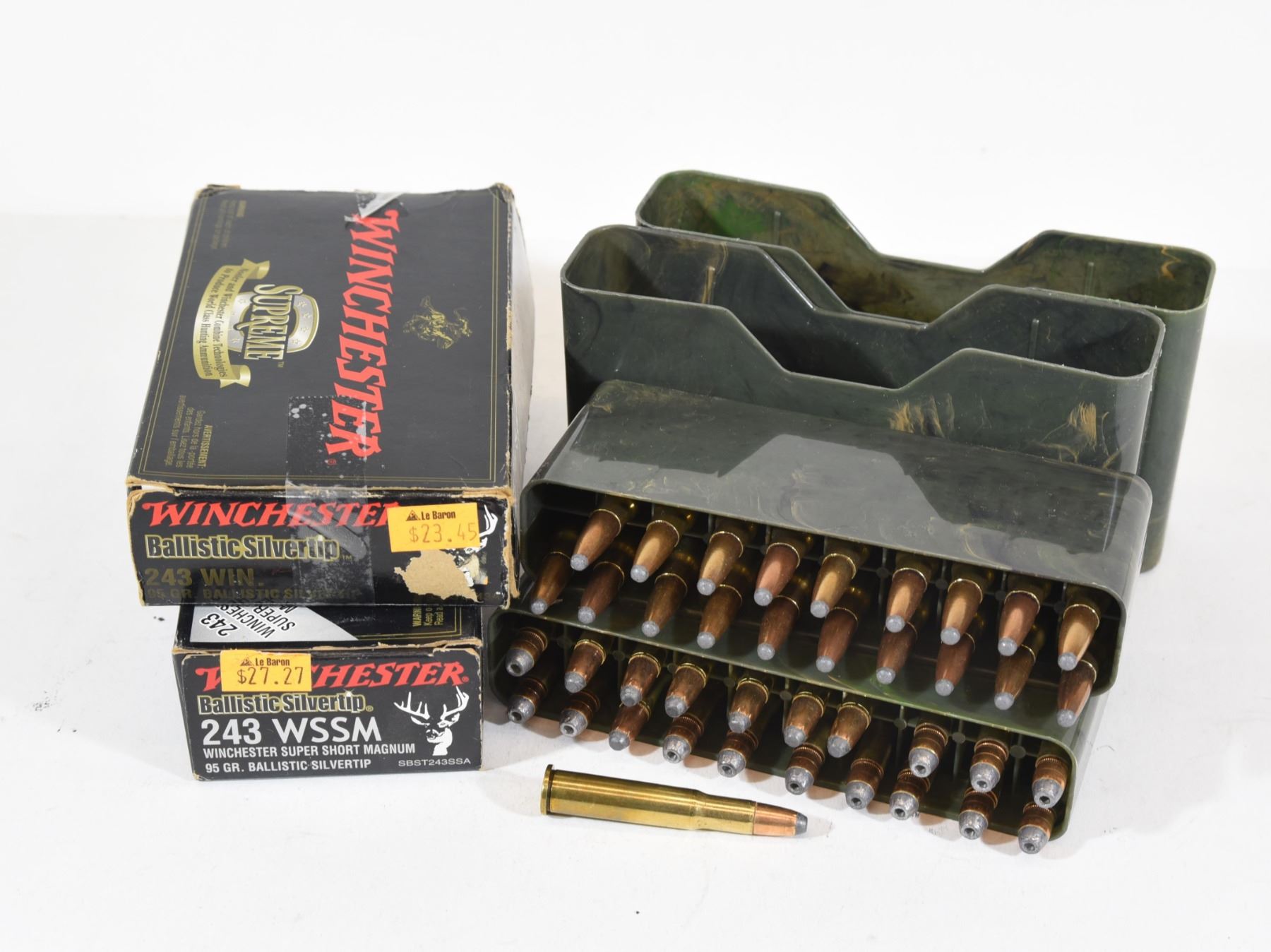 1) 6 rounds 243 and 13 pieces of once-fired brass 2) 9 rounds 243 win. short mag. and 8 pieces of brass 3) 19 rounds 7.65x65 in an MTM Case-Gard box 4) 13 rounds 30-30 hp & 8 rounds sp in an MTM Case-Gard box