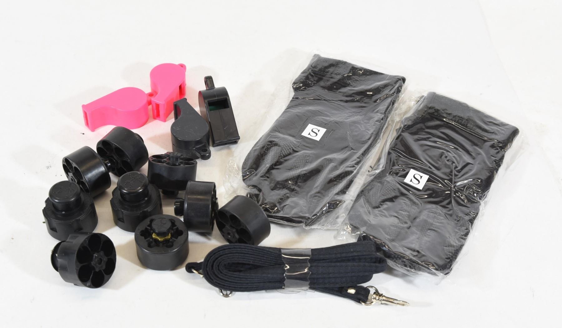 Two pink and two black whistles, two size small gloves, lanyard, nine speed loaders.