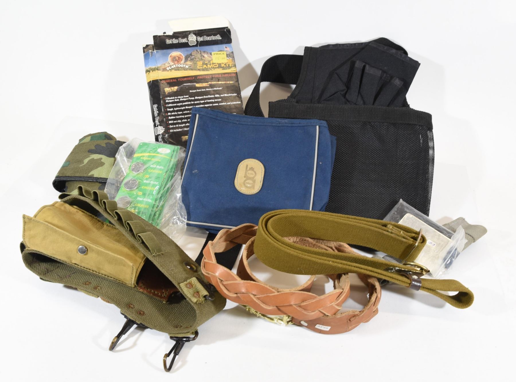 1) Small Browning Broken Birds gear bag and an Allen shell bag 2) Cloth camo gun sock 3) Military style shell/accessory belt 4) Canvas gun sling 5) Canvas frog 6) Leather belt with cowboy buckle size S/M 7) 20 3V CR2032 batteries of unknown age 8) 3 piece camo rifle