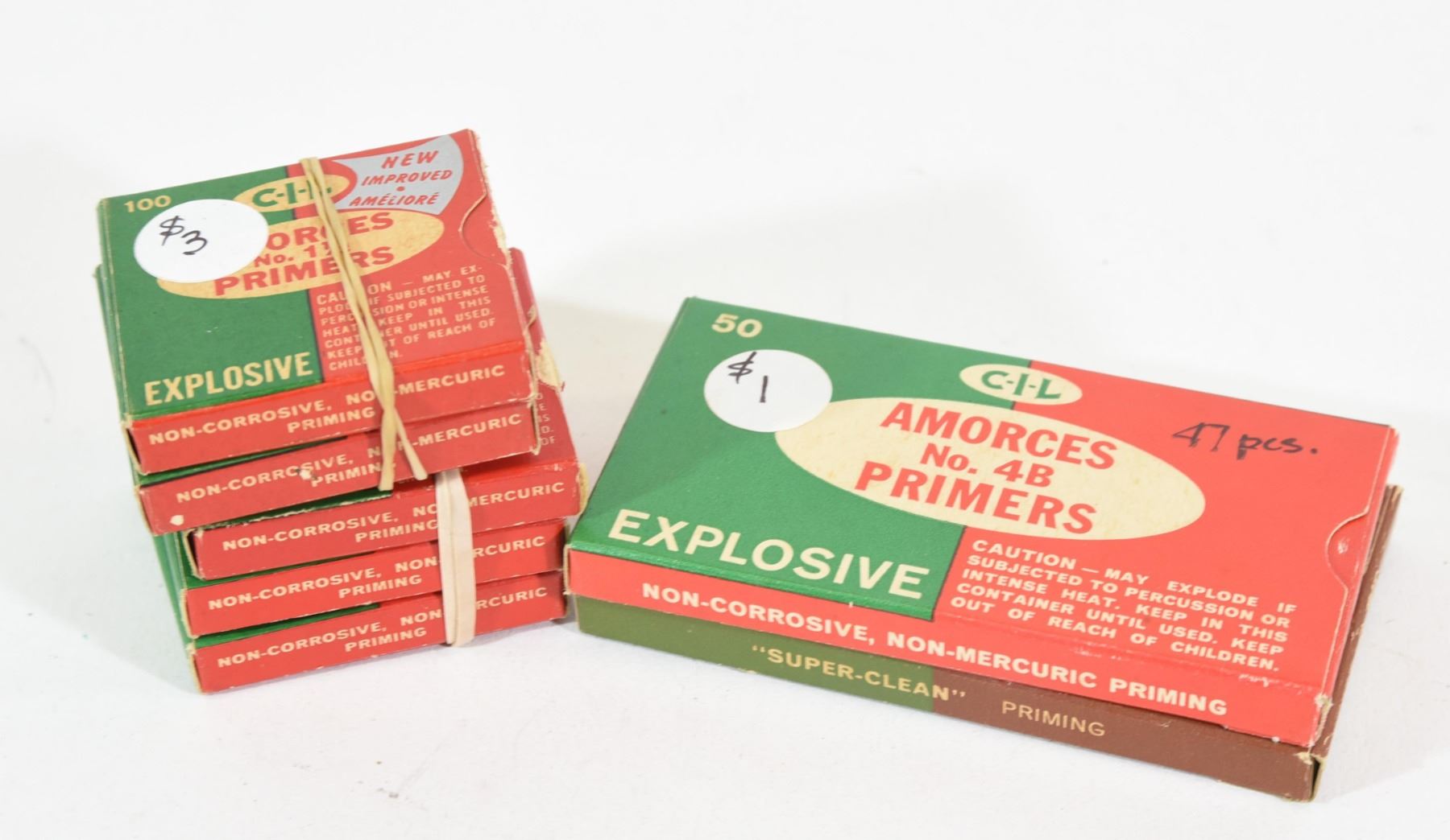 1) 300 pieces C-I-L No. 1 small pistol primers 2) 200 pieces C-I-L No. 1 1/2 small rifle primers 3) 97 pieces C-I-L No. 4B primers