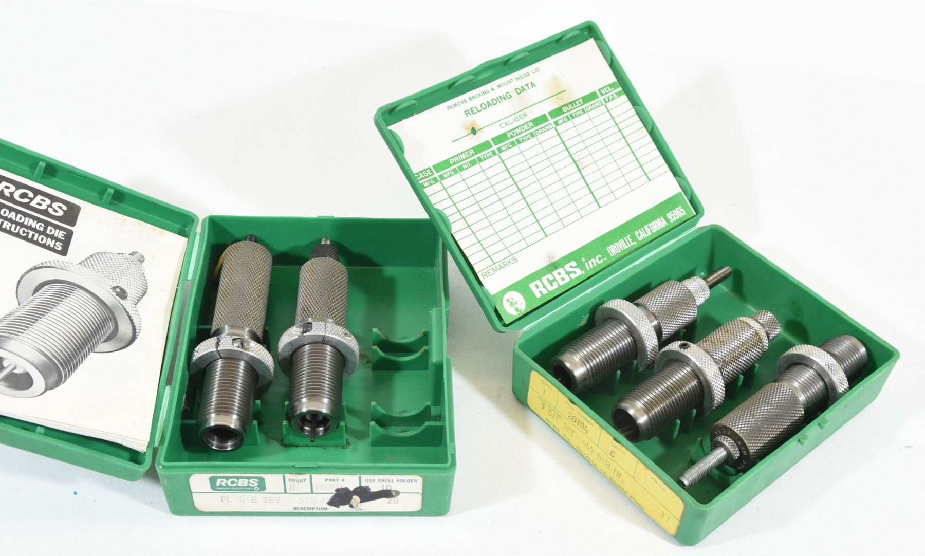1) RCBS 3 die set, part # 20704 for 444 Marlin in very good condition 2) RCBS 2 die set, part # 16981 for 375 H & H in good condition