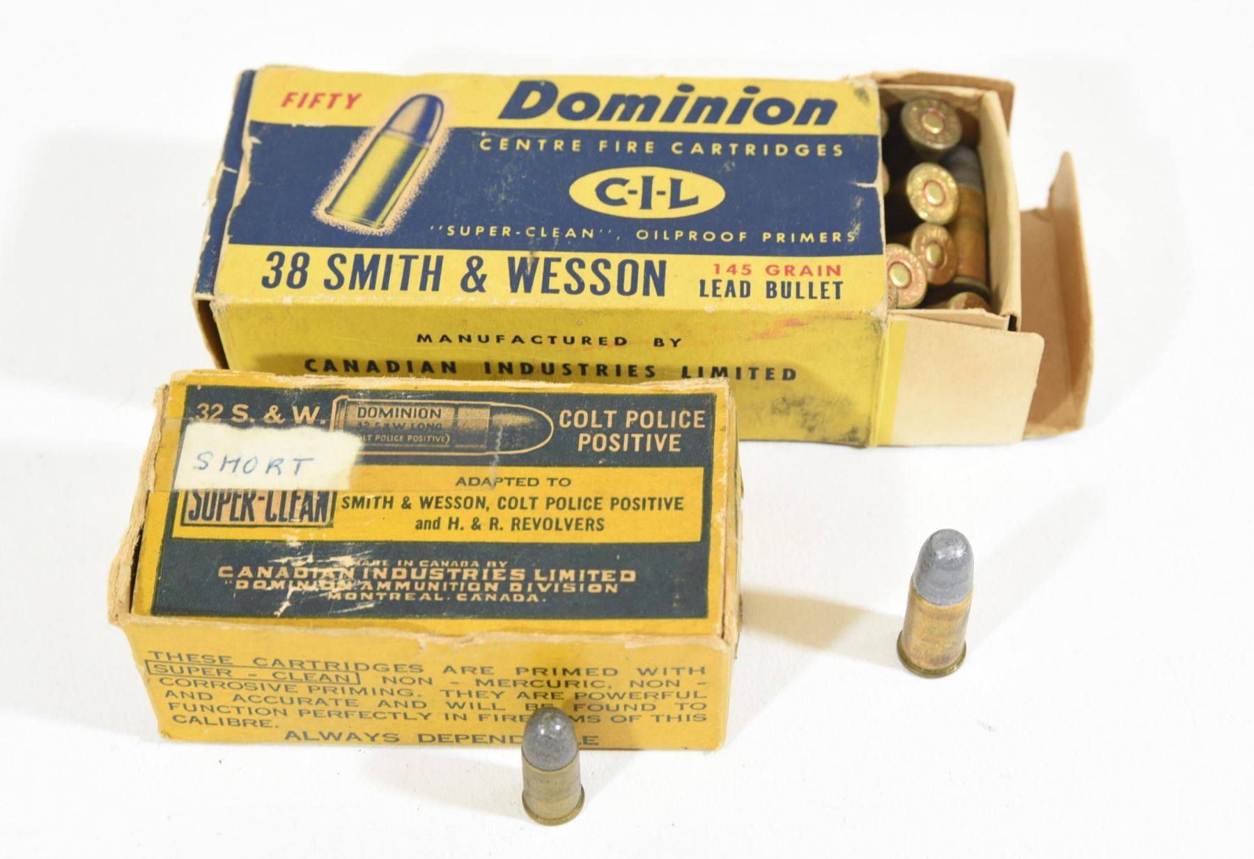 1) 50 rounds 38 S & W 145 gr. lead bullet in a vintage Dominion C-I-L box 2) 35 rounds 32 S & W short 98 gr. lead bullet in a vintage Dominion box