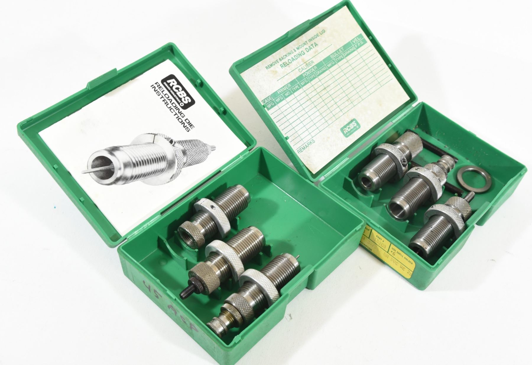 1) RCBS 3 die set for 38/357 in good condition 2) RCBS 3 die set for .45 ACP in good condition