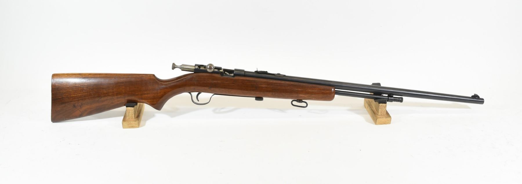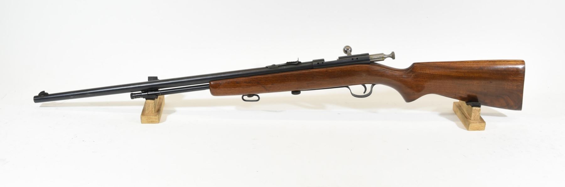 Non-restricted, bolt action .22 cal. s-l-lr, 24" barrel, SN none. Wood has some dents and scratches, sling screw stud broken off in butt stock, bluing has minimal surface rust and a couple of scratches, bore is excellent.