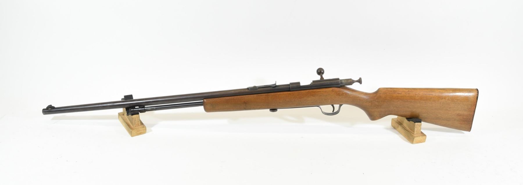 Non-restricted, bolt action, .22 cal., 24" barrel, SN none. Wood has light marks, finish is coming off, bluing is brown, butt plate is rusty, bore is excellent.