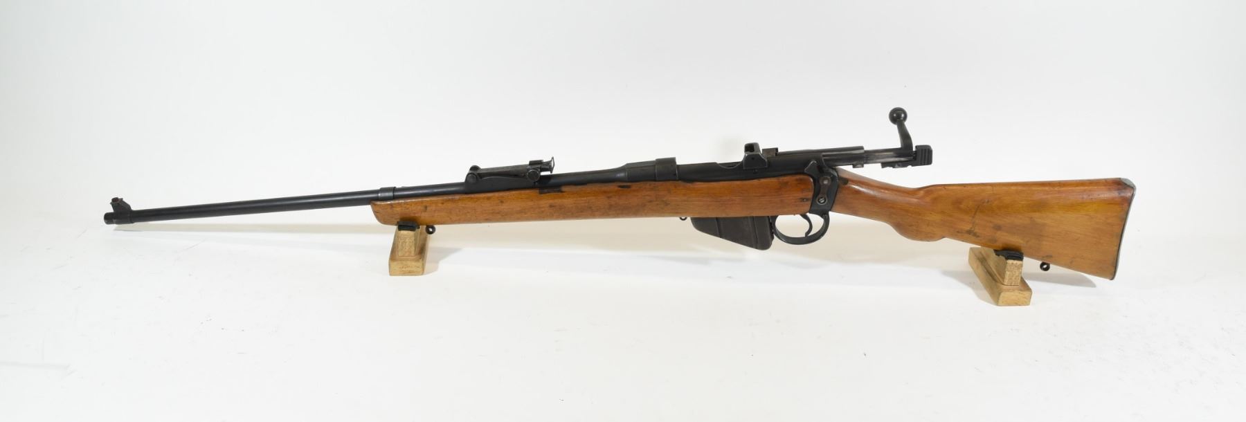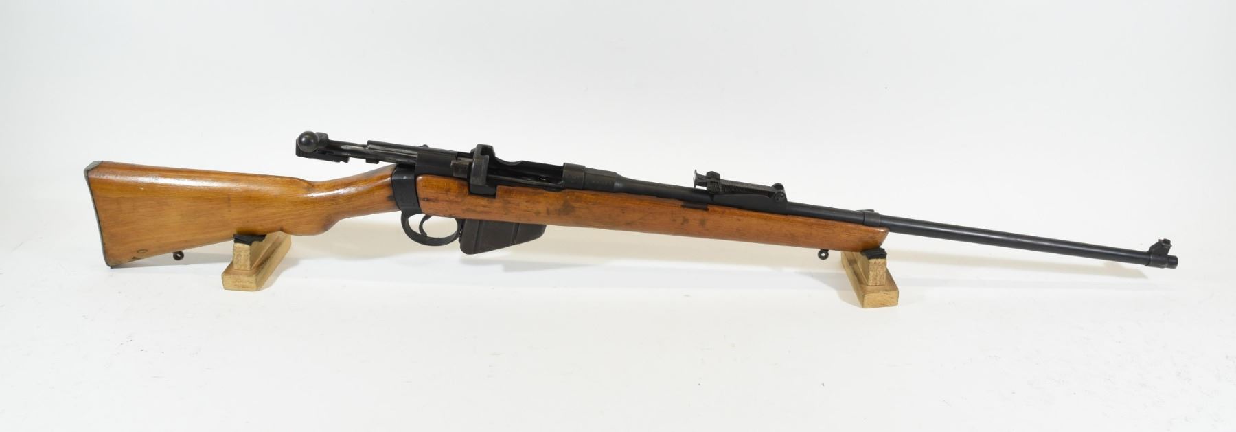 Non-restricted, bolt action, .303 British, 25" barrel, SN 15912 H. Wood has some marks and dents, bluing is good, bore is dark rifling is prominent.