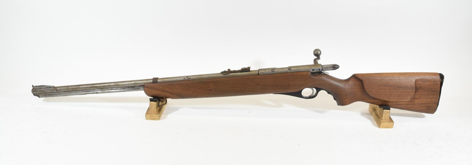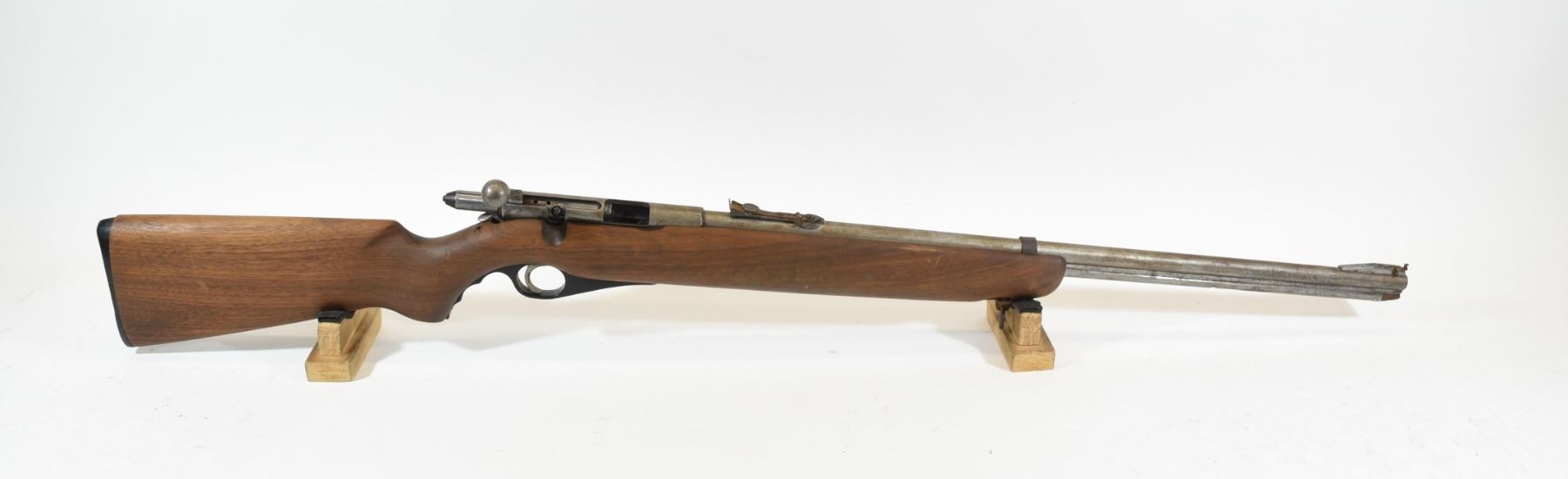 Non-restricted, bolt action, .22 cal., 26" barrel, SN none. Wood has a few scratches and has been refinished, bluing is grey, bore is very good, butt plate is broken.