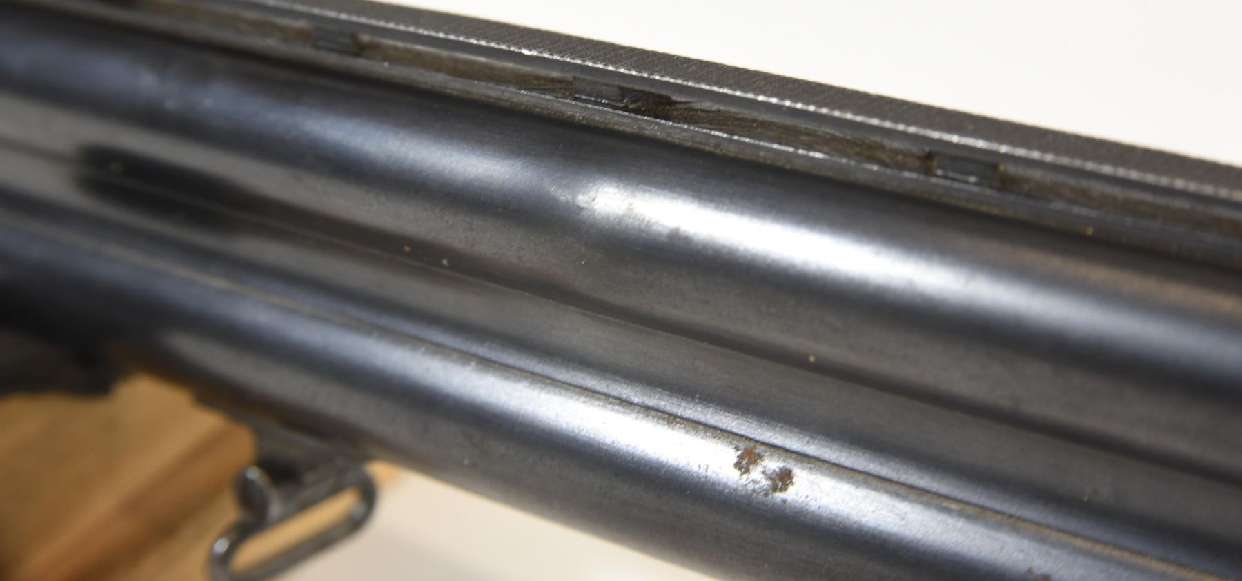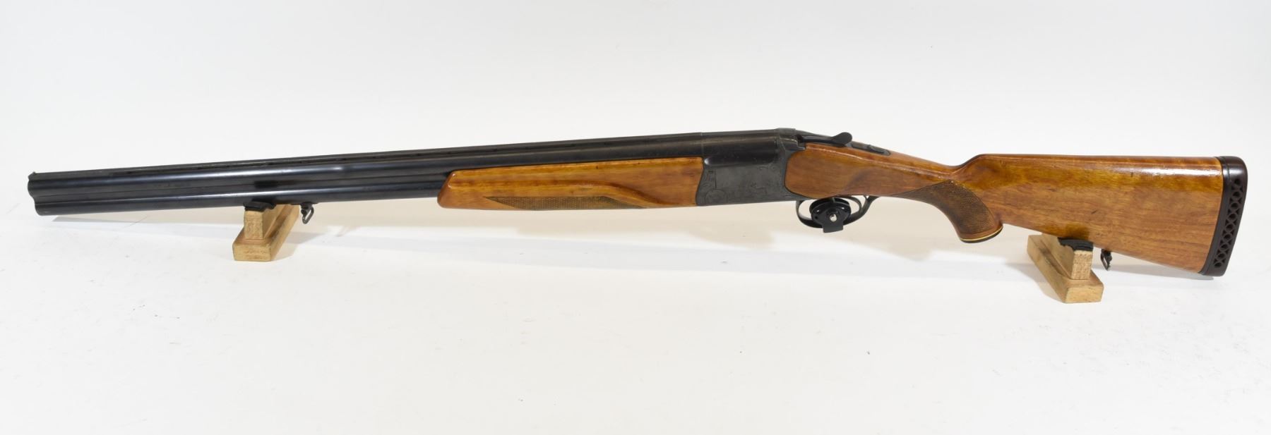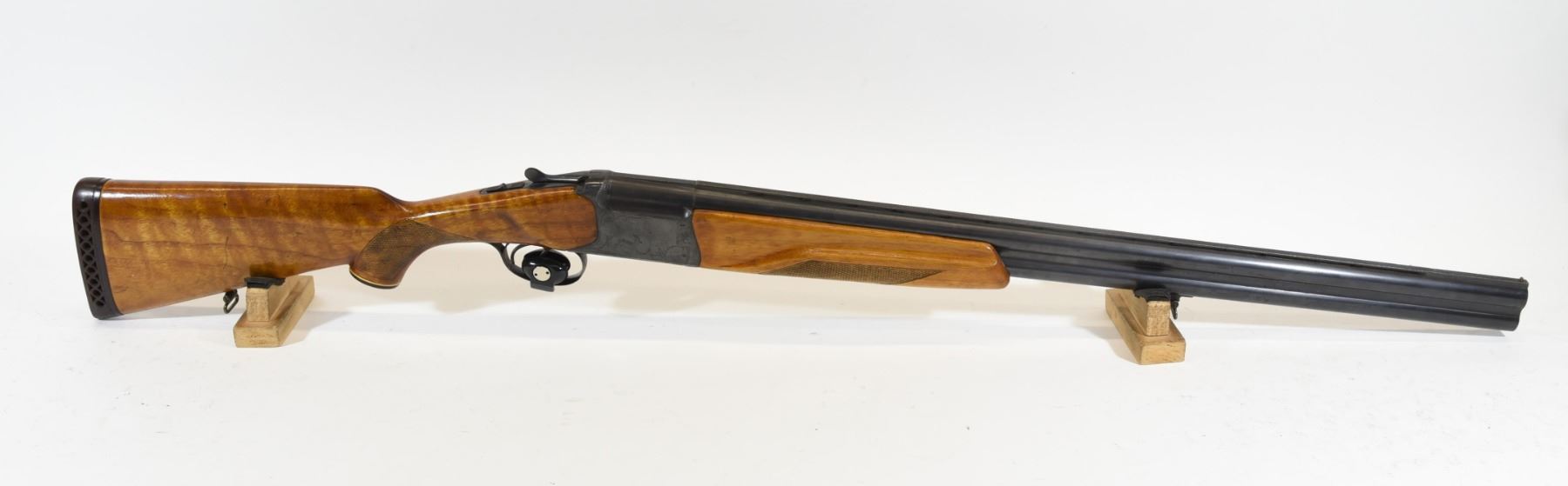 Non-restricted, multi barrel O/U, 12 ga. x 2 3/4", 29" vent rib barrels with max full and mod. chokes, top barrel has a bulge 12 1/2" from muzzle, SN X15481. Wood has a fine crack in the fore stock, wood has been refinished, bluing has some surface rust, bores are good but, as mentioned, top barrel has a bulge.